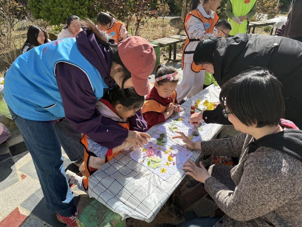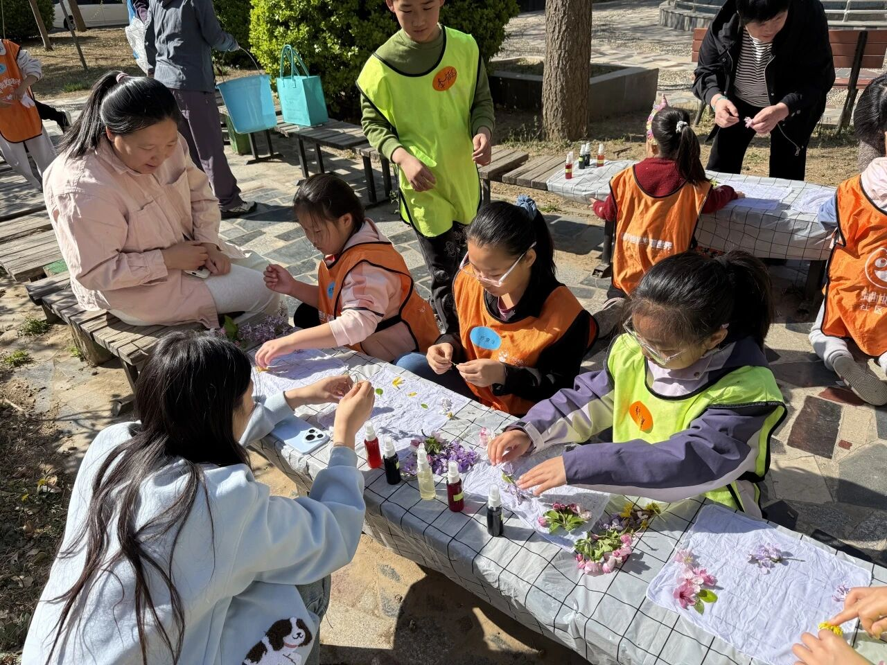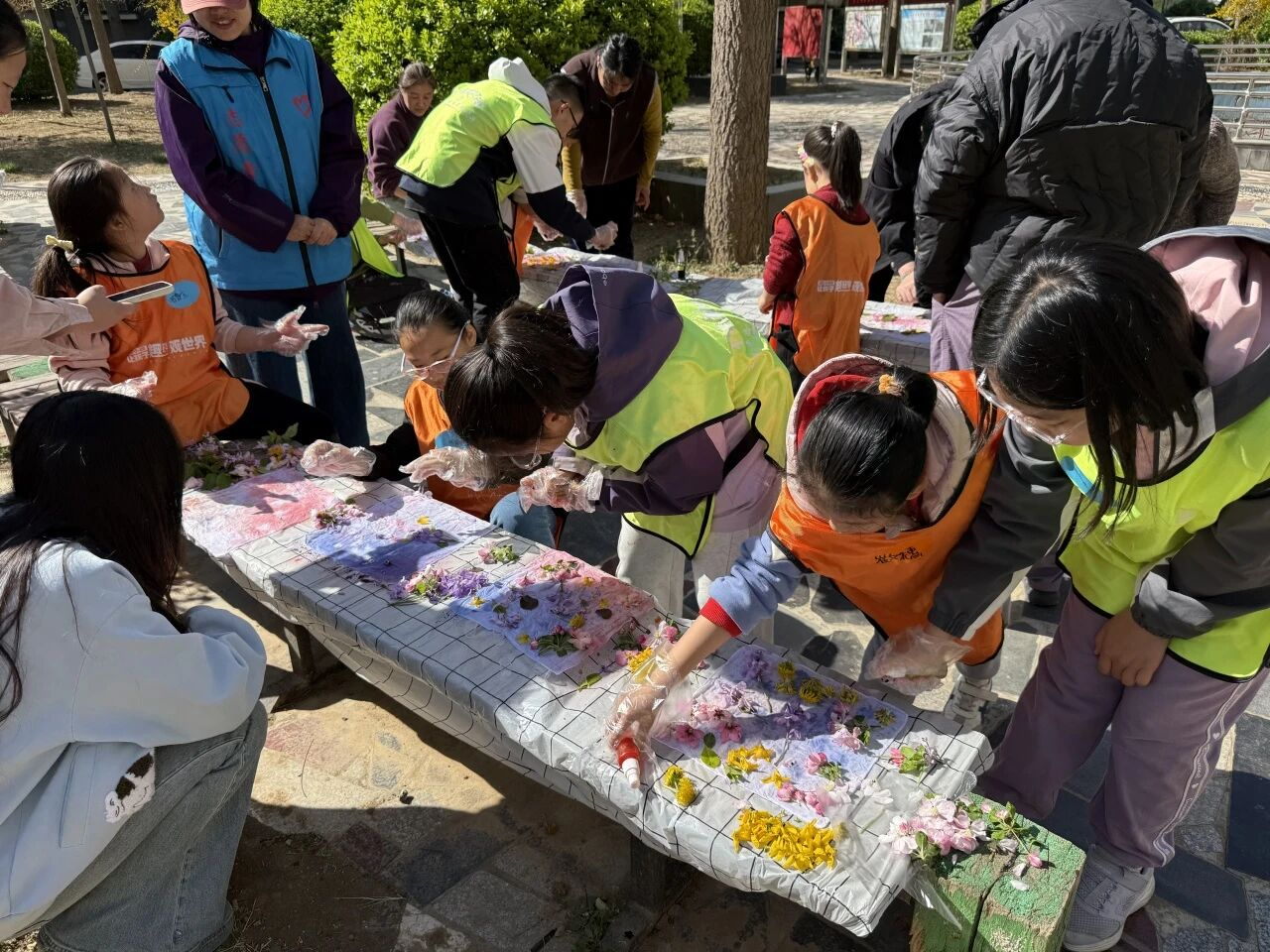 实践环节,孩子们在小公园中寻找形态各异的花瓣、叶片,将它们精心铺在白布上,再用喷壶喷洒天然染料。随着色彩慢慢晕染渗透,叶脉纹理、花朵轮廓自然浮现,每一件作品都独具匠心、独一无二,孩子们看着自己的成果,脸上洋溢着惊喜与自豪。