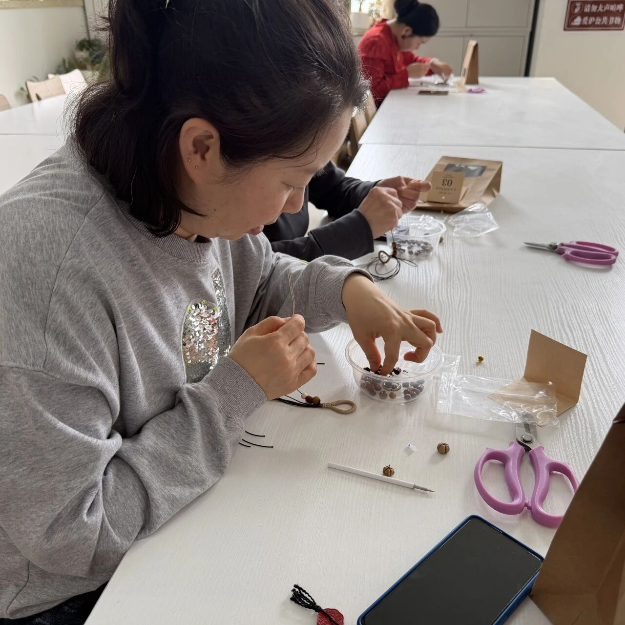 活动中,非遗手作老师为大家详细讲解了五福籽挂饰的文化渊源、制作工艺及原料寓意:黄芪寓意元气满满、福气常伴,橡果象征生生不息、所愿皆成,搭配木牌与挂饰更含平安顺遂之意,五福汇聚,寓意“五福临门”。在老师的指导下,大家纷纷投入到创作中,认真选材、串珠、组装,将自然的灵气与草木的温润,串成了一件件独具心意的随身挂件。