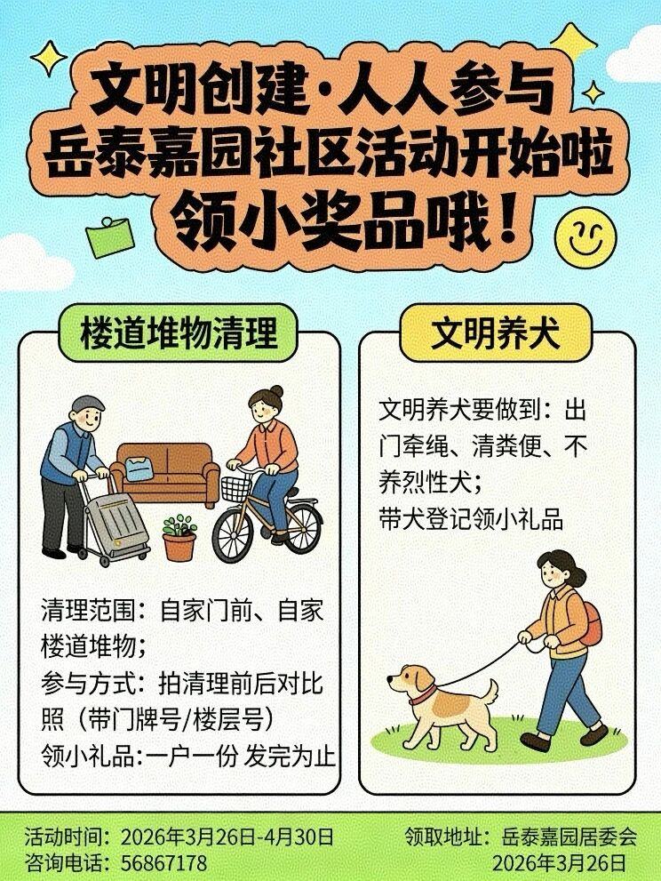 从“被动管理”到“主动参与”,用小支点撬动基层共建共治共享大格局。岳泰嘉园社区开展此次“清理杂物 文明养犬 领礼品”活动不仅是一次环境整治行动,更是社区治理的一次创新实践,为创建全国文明城区贡献力量。