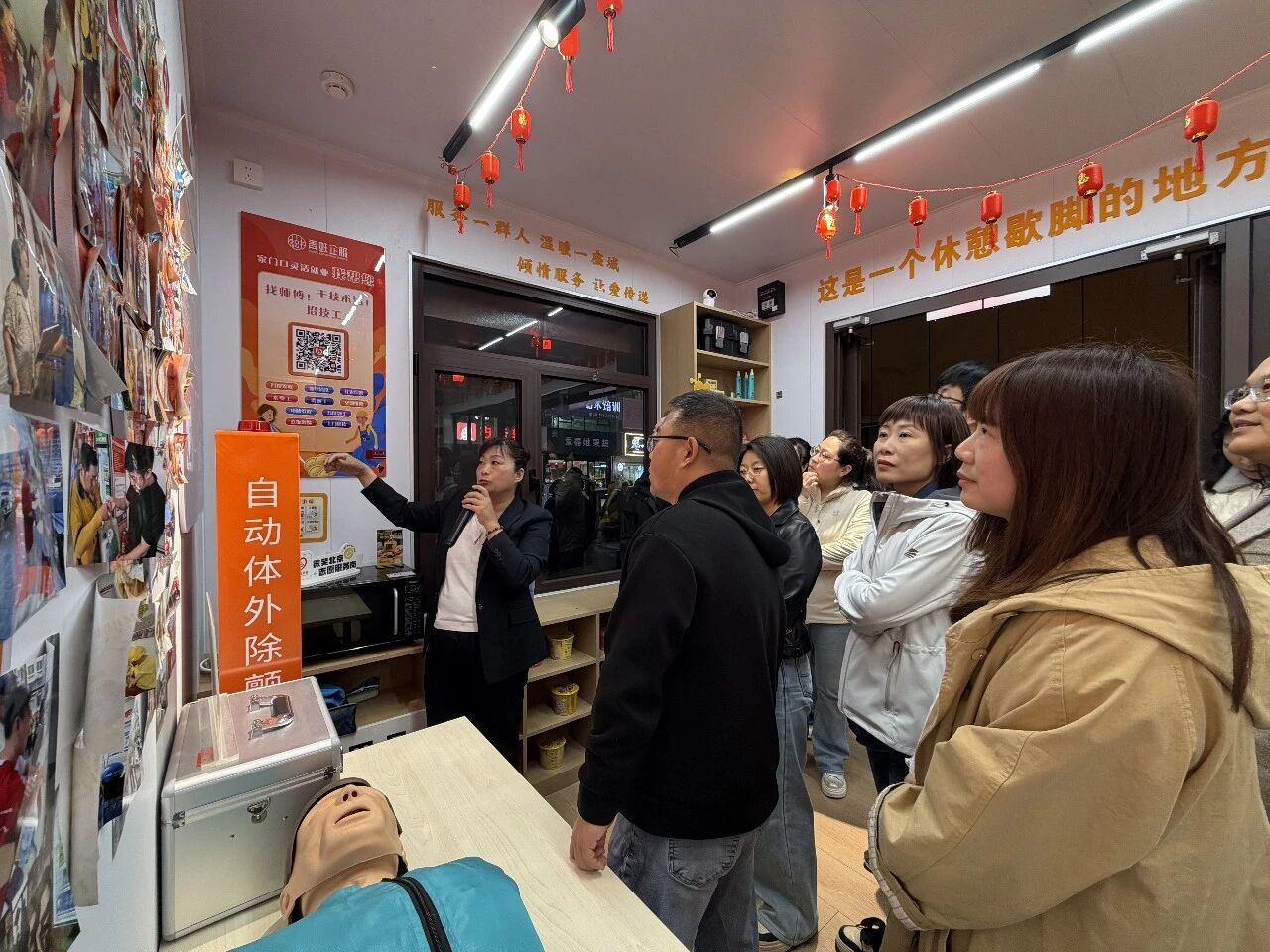 随后,学员们实地参观了步行街“暖心驿站”,王玉荣书记向学员们介绍驿站在为外卖骑手、快递小哥提供休息补给、应急救助、技能培训等方面的服务举措。学员们边走边看、边问边学。