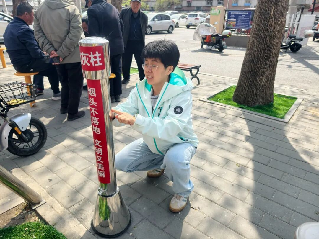 常态化开展烟头捡拾志愿活动。社区广泛动员党员、热心居民等组成志愿服务队,对辖区重点区域进行地毯式清理;同时社区推出“烟头兑换小礼品”激励机制,鼓励居民主动参与捡拾,有效调动了居民的积极性;开展文明劝导志愿活动,耐心向居民讲解乱扔烟头的危害,倡导文明吸烟习惯,引导居民自觉遵守公共卫生准则,从源头减少乱丢现象。 安装烟灰柱,分别在社区小公园、棋牌区等人员密集、烟头易乱丢的醒目位置,安装了5个烟头收集器,从硬件上补齐环境治理短板。