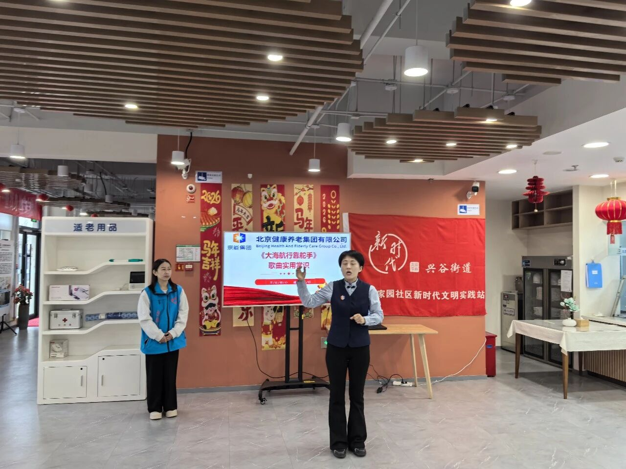 在正式唱歌前,老年人们先进行了呼吸练习、发声训练和手势舞等充分的热身准备。随后,在音乐老师的带领下,大家采取“一句歌词配合一个动作”的方式,从逐句学唱经典红歌入手,再逐步学习相应的舞蹈动作,逐一细致讲解。老人们认真聆听、专注投入,学习热情高涨。经过反复练习,大家最终将歌声与动作融为一体,实现边唱边跳,情绪愈发高涨。