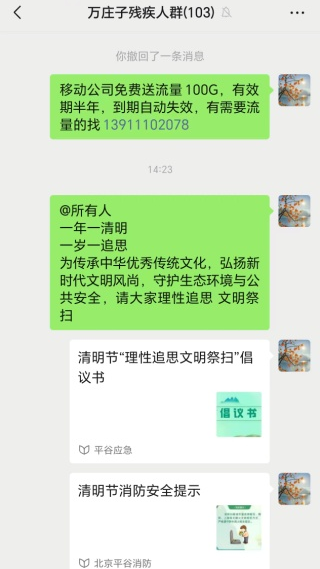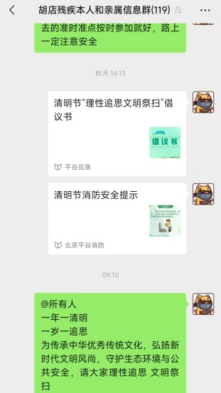 刘家店镇依托镇级微信公众号,及时转发文明祭扫、消防安全相关信息,扩大宣传覆盖面;镇残疾人温馨家园聚焦服务对象及家属群体,通过专属微信群精准推送清明节消防安全提示与文明追思倡议书,内容紧扣防火安全、出行安全、健康安全三大核心要点,细致讲解祭扫防火、居家用火用电、清明出行防护等实用安全知识,同时大力倡导鲜花祭扫、网络祭扫、家庭追思等低碳环保缅怀方式,弘扬厚养薄葬的传统孝道文化,呼吁家属多陪伴长辈,以文明之举践行孝道、摒弃祭扫陋习。