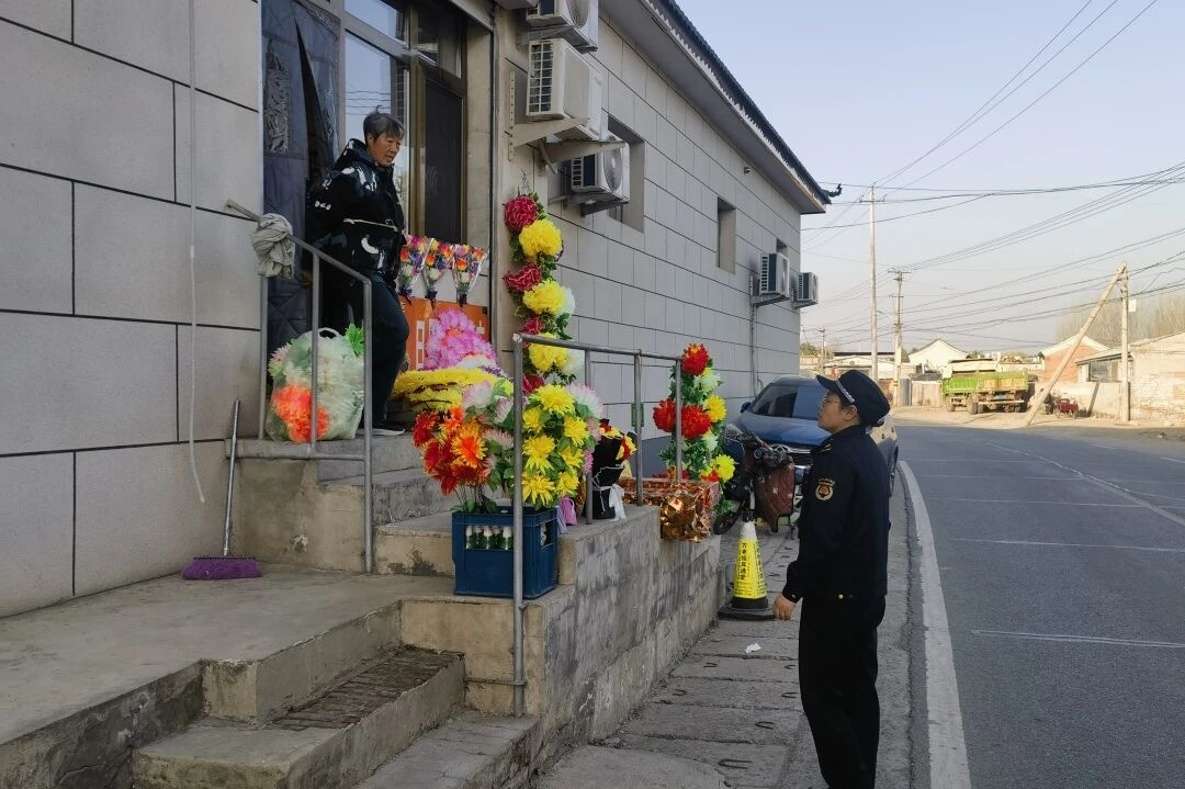 镇综合执法队员深入沿街商铺,对祭祀用品销售点位开展巡查劝导,引导商户推广鲜花祭扫等绿色文明方式,从源头减少焚烧隐患,让缅怀更环保、更温情。