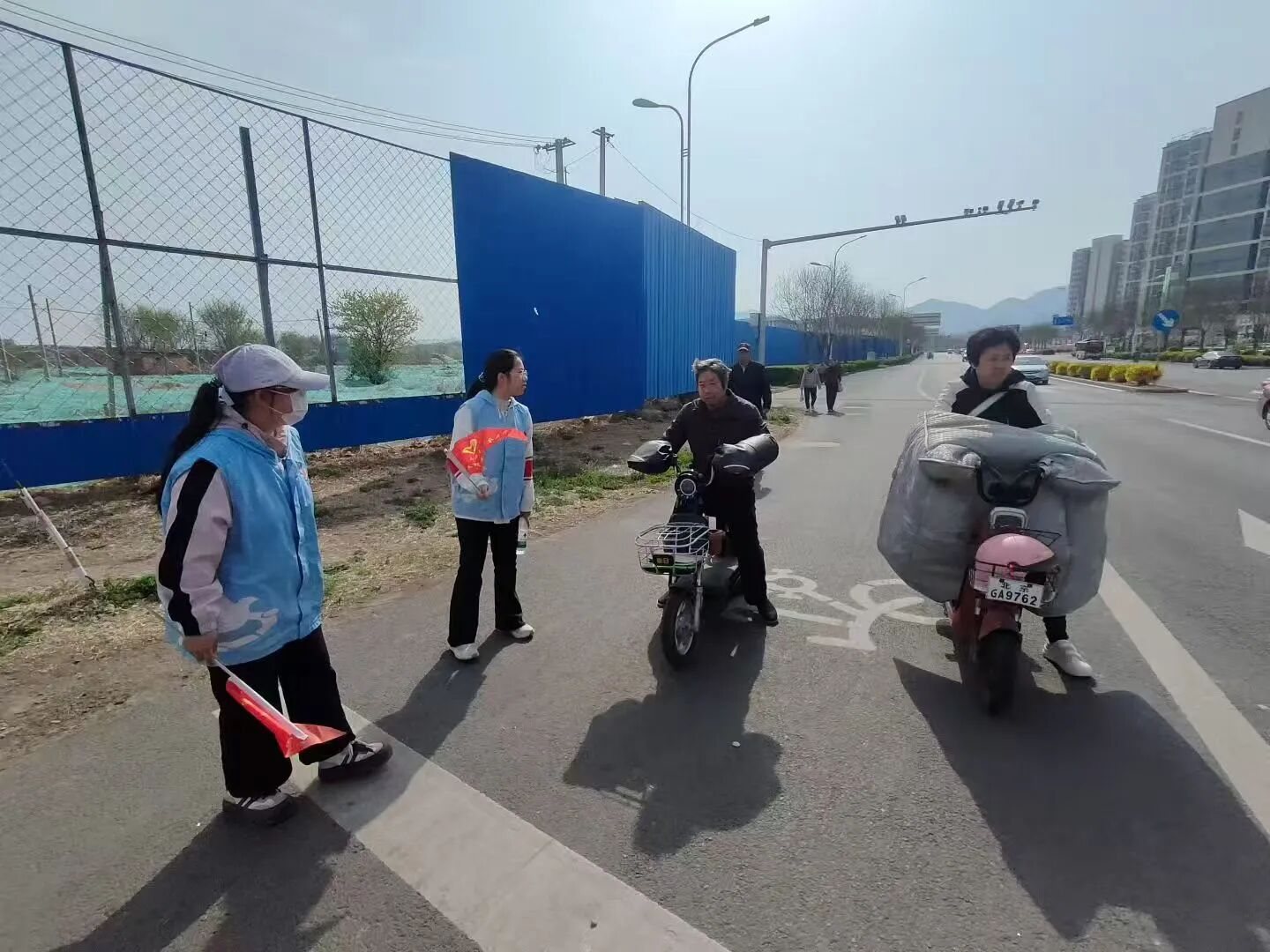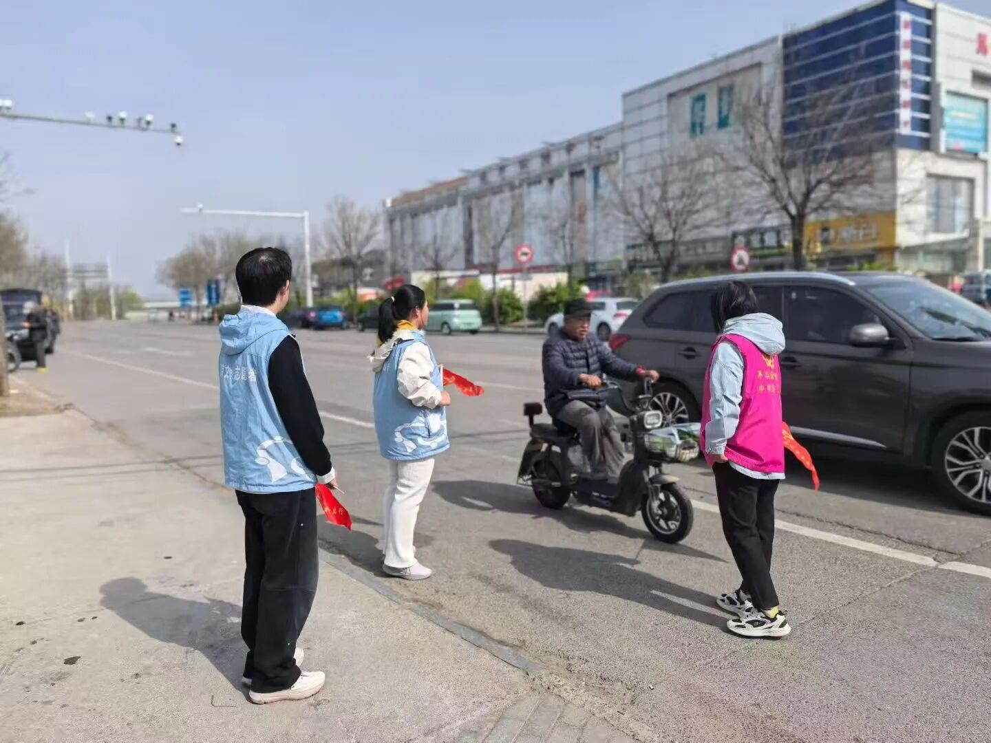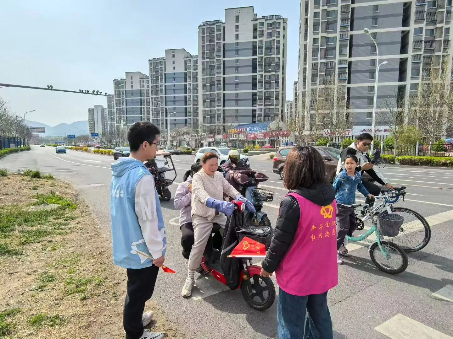 活动现场,金玫瑰志愿者,文化志愿者,手持文明劝导旗帜,在银河购物中心路口人流、车流密集区域,有序开展交通安全劝导与宣传工作。针对电动自行车骑行者未佩戴安全头盔等常见问题,志愿者们主动上前,耐心细致地向过往群众讲解骑行佩戴安全头盔的重要性,以及不戴头盔、违规骑行带来的安全隐患与严重后果。