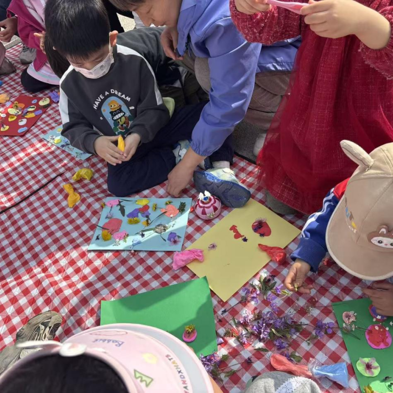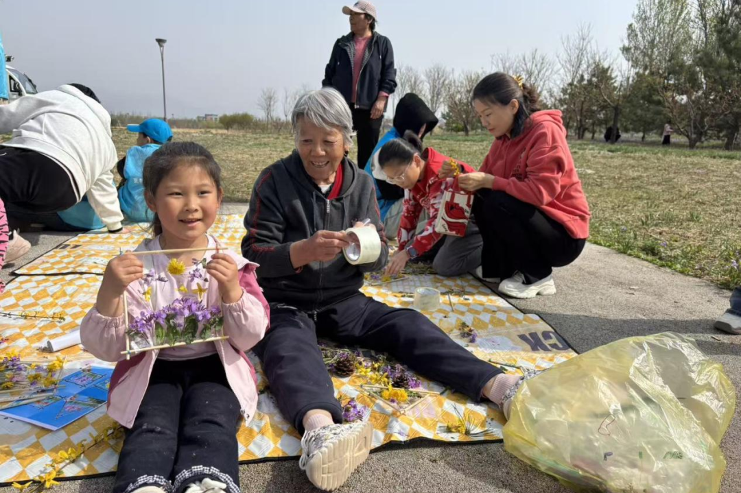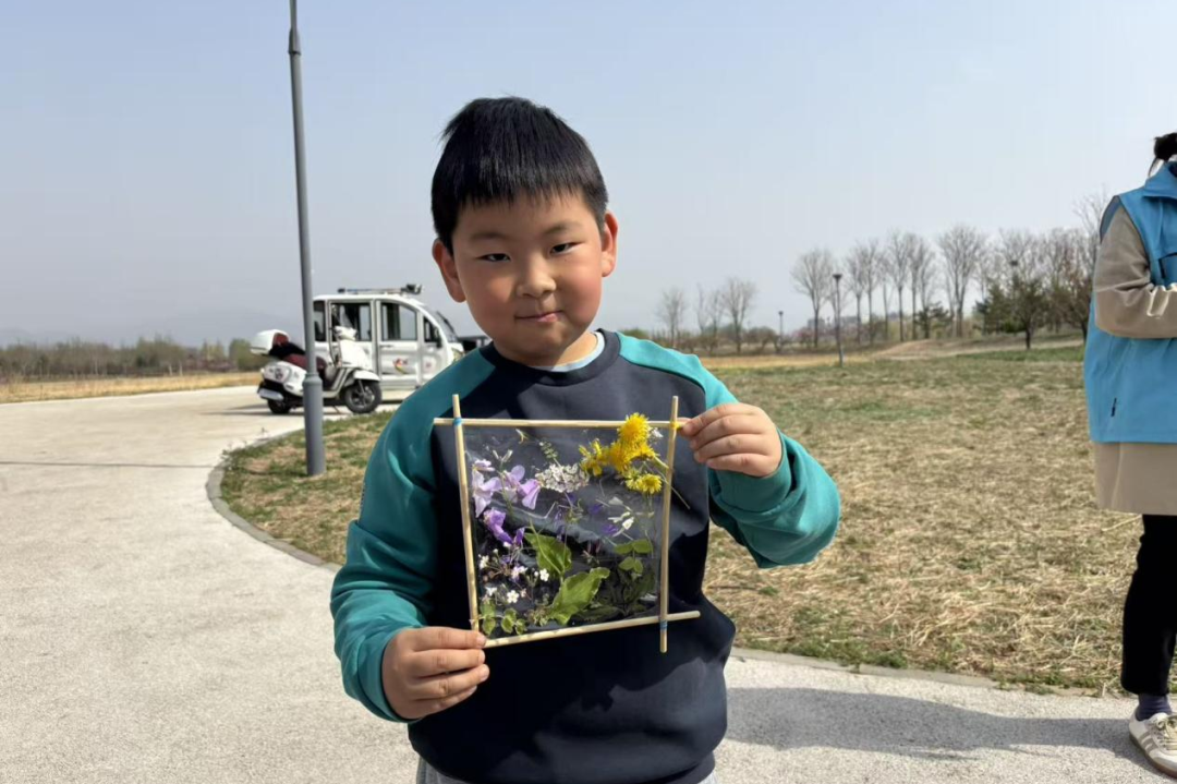 徒步终点的创意手工区格外热闹。社区为孩子们准备了彩色黏土、干花、枝叶等材料,邀请大家自由创作花草粘贴画。