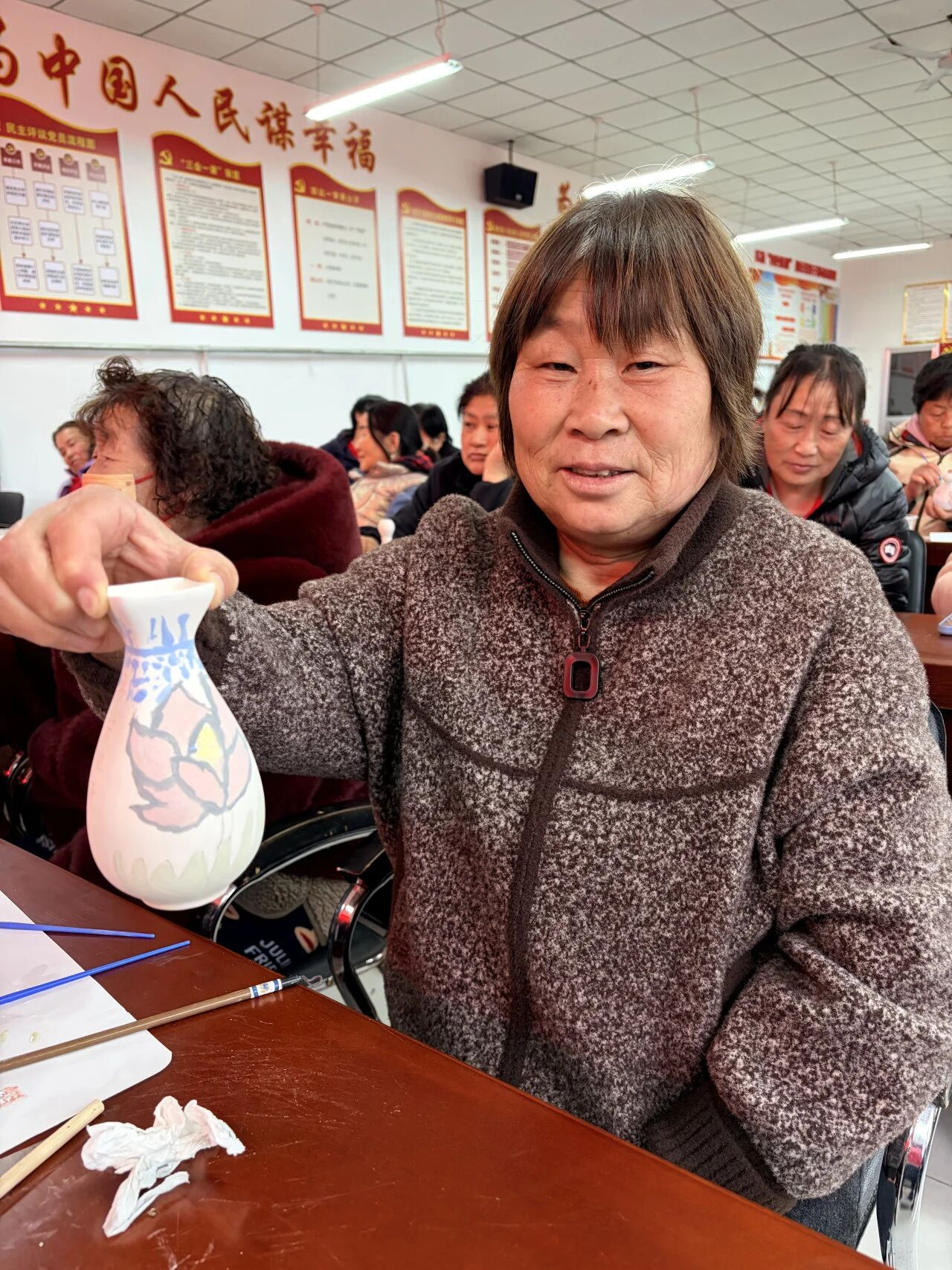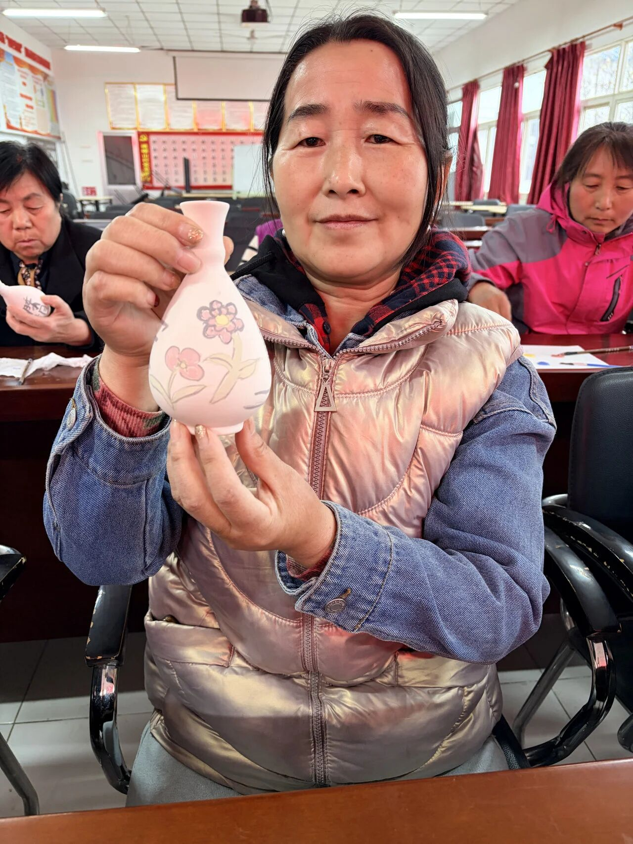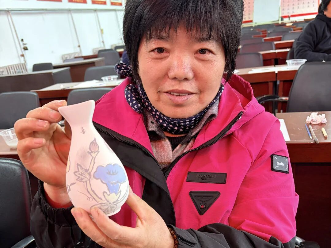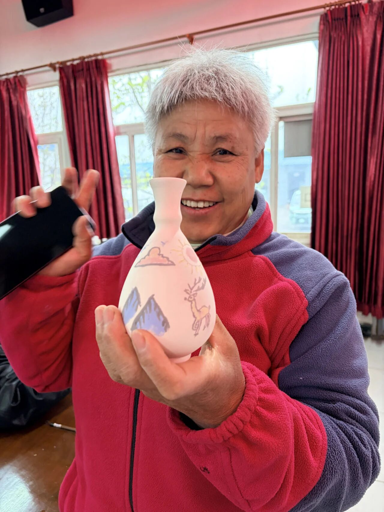 “活了大半辈子,还是第一次在花瓶上画画,虽然不算专业,但越画越开心,整个人都轻松了!”一位阿姨一边涂色,一边笑着分享感受。没有专业门槛的限制,没有完美标准的束缚,大家凭着对生活的热爱创作,每一件作品都独一无二,既藏着乡村生活的质朴温情,也承载着大家对美的追求。大家都满心期待着作品经窑火淬炼后的模样,脸上满是成就感与期待。