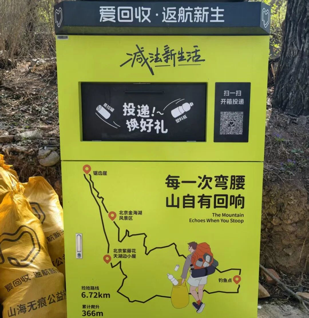活动前期,爱回收在金海湖镇锯齿崖步道入口处安装投用了太阳能智能回收机,进山游客及周边村民可通过投递可回收物兑换相应积分。这一“可回收物投递+积分激励”的模式,不仅为群众提供了便捷的垃圾分类与回收渠道,也借助科技手段有效弥补了山野户外环保治理的短板。