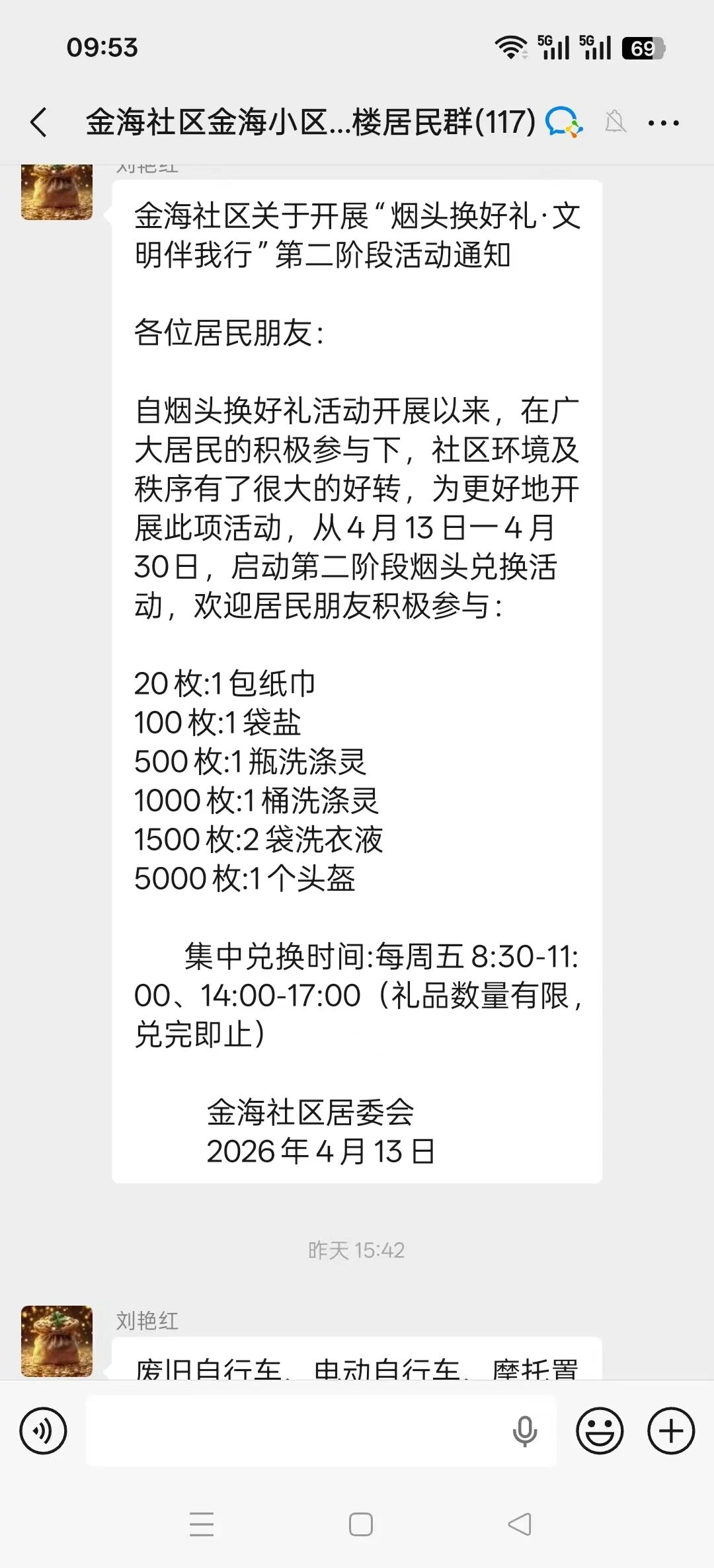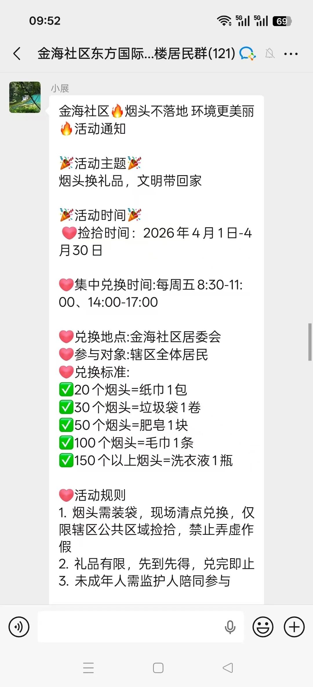 活动前,社区通过网格微信群发布通知,明确活动时间、方式及兑换规则,积极动员居民参与。同时组织志愿者常态化开展周末大扫除,对辖区主次干道、绿化带、广场等区域的烟头、垃圾进行清理,发挥示范引领作用。