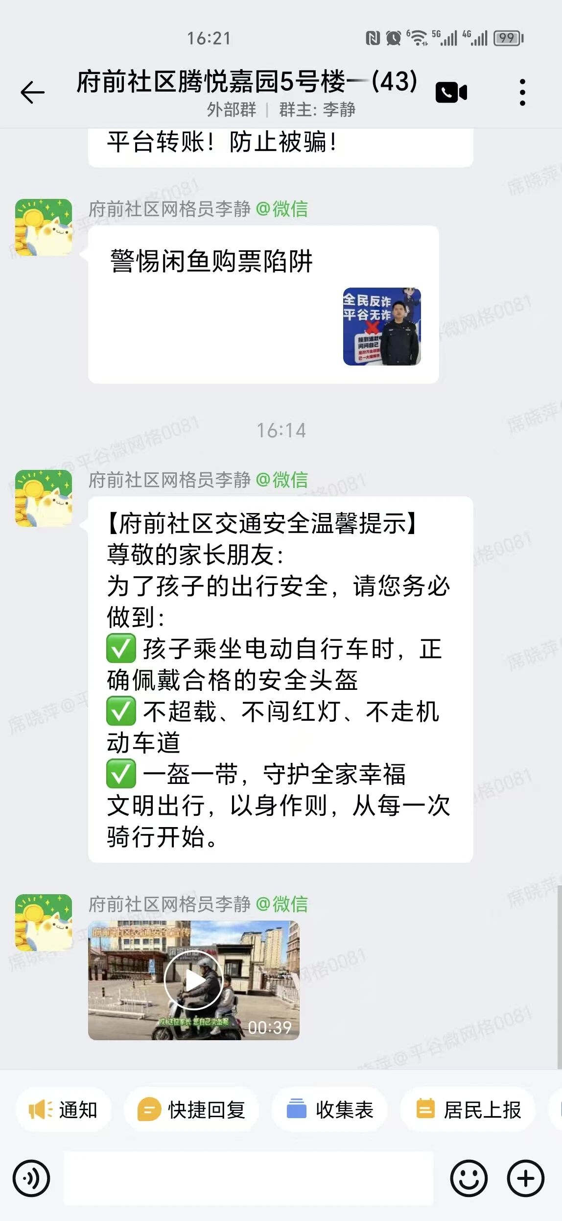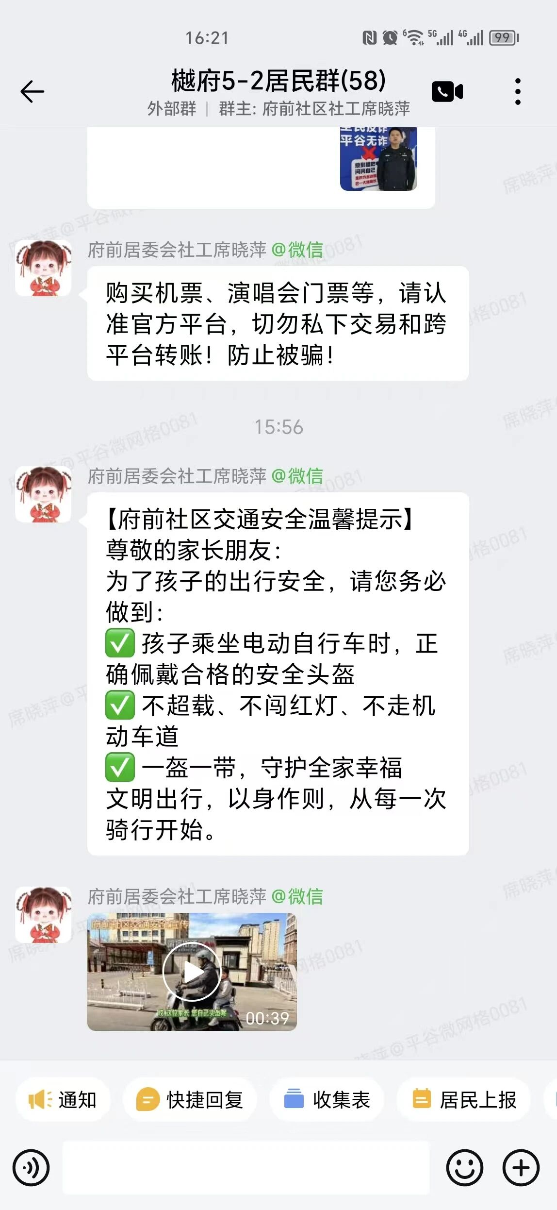 活动中,社区自制宣传视频,面向居民线上推送安全出行知识,重点提醒:驾驶、乘坐电动自行车时,大人与儿童均须全程规范佩戴合格安全头盔并系紧卡扣;骑行中严禁超载、闯红灯、逆行、占用机动车道,主动摒弃交通陋习。