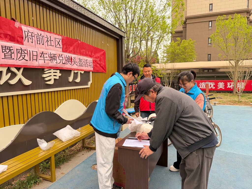 近日,府前社区开展僵尸车清理暨废旧车辆兑换头盔活动,规范非机动车停放,释放公共空间,深化“一盔一带”安全宣传。