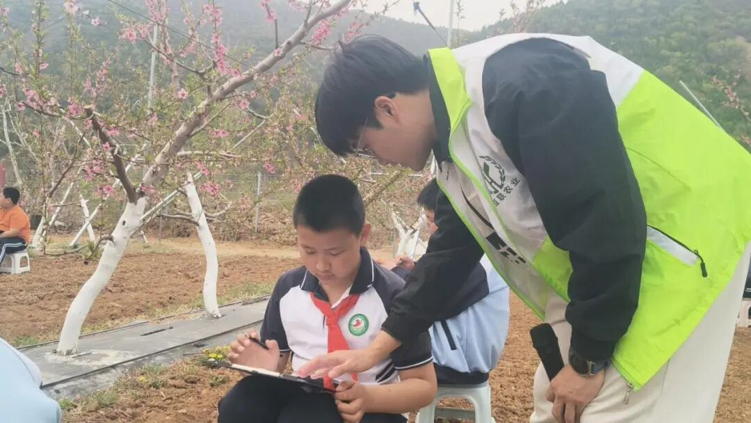 活动现场,万亩桃园繁花似锦,粉白桃花与春日绿意相映成趣,成为学生们天然的创作课堂。孩子们身着校服、系着红领巾,行间排排坐,勾勒着春日桃景,科技小院的工作人员全程驻场指导,围绕谷雨节气展开趣味科普,用通俗易懂的语言讲解谷雨的由来、物候特征,以及“雨生百谷”对农业生产的意义,结合桃园春日景致,让学生理解节气与农耕的紧密关联,感受传统农耕文化的魅力。