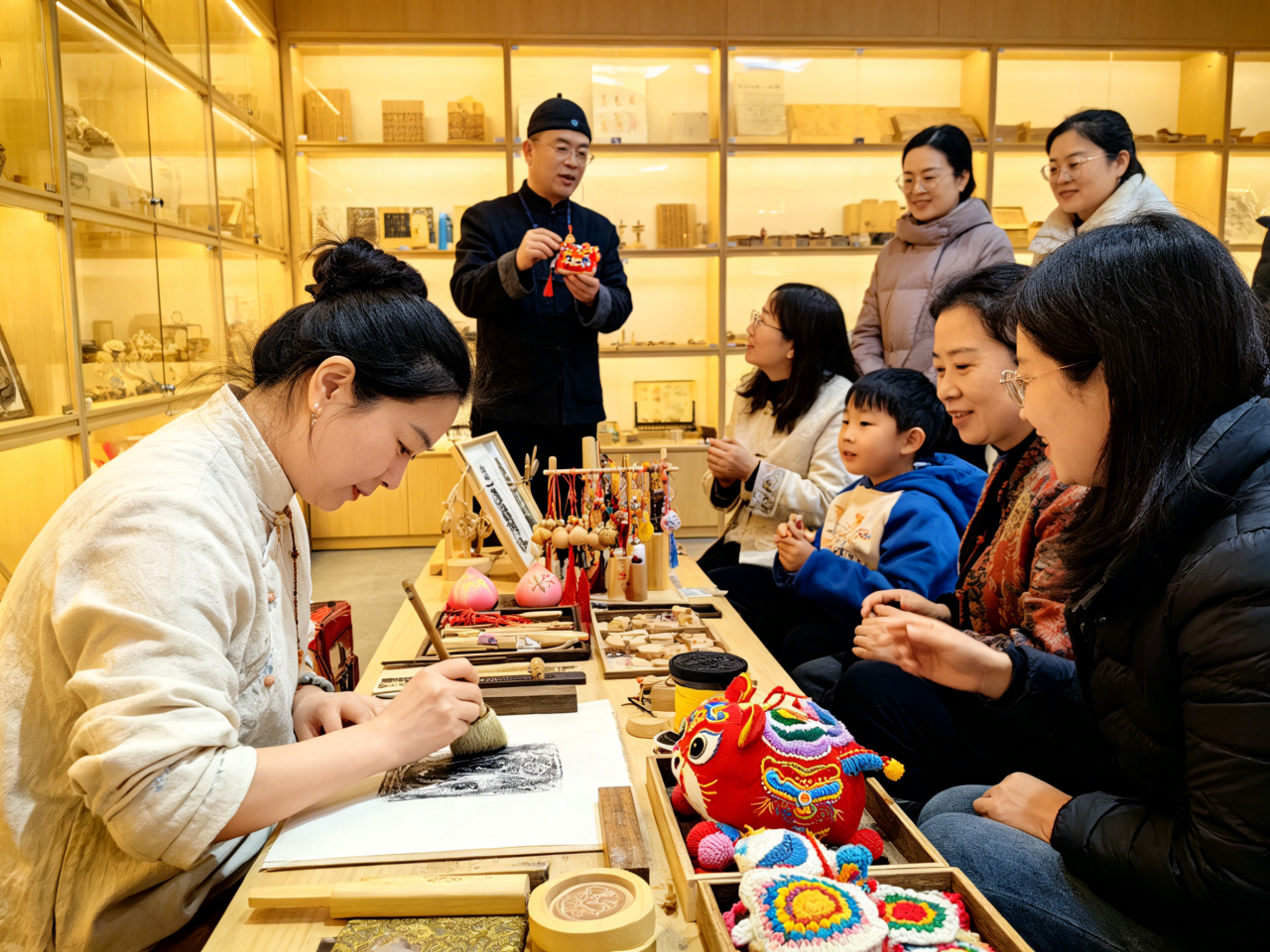 在这里,你可以亲手体验非遗拓印,在一笔一划、一拓一印间,感受传统技艺的独特韵味;可以近距离观赏桃木手作、布老虎、手工钩织等非遗文创展品,聆听非遗匠人讲解技艺背后的故事;更能与非遗传承人面对面交流,亲手参与非遗手工制作,零距离触摸千年非遗文脉,亲身参与非遗文化的传承与活化。