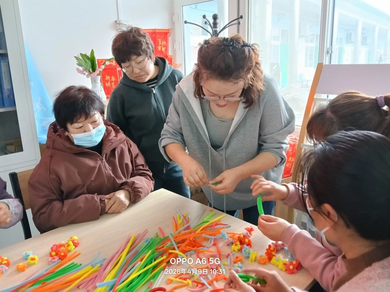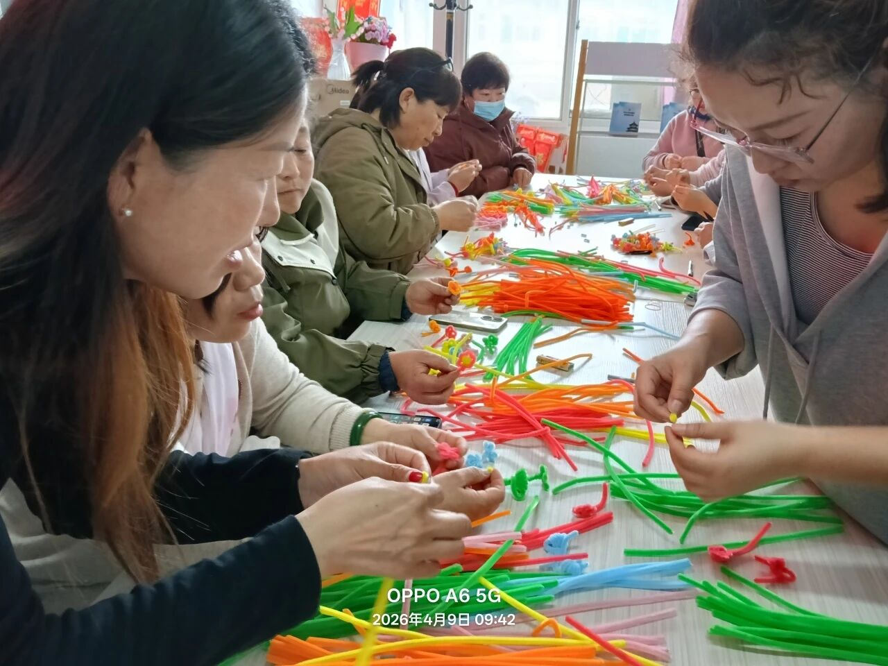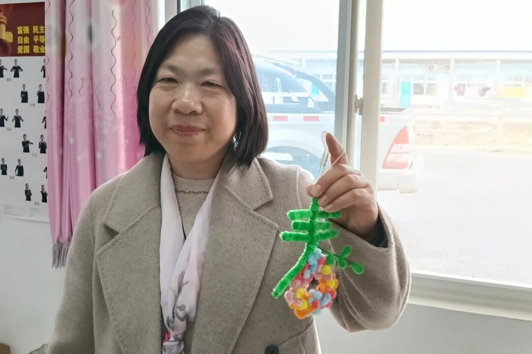 老师们全程耐心细致指导,手把手教大家掌握绒花制作的每一个步骤。学员们神情专注、认真钻研,时而围在一起交流制作技巧,时而互相协作调整细节,不时分享彼此的创作心得,氛围格外融洽。大家跟着老师的节奏,在指尖翻飞间,通过折、扭、捋将粉色绒条细细塑形,变成一片片娇艳的花瓣;把绿色绒条精心打理,化作一片片嫩绿的叶片,再小心翼翼地将花瓣与叶片捆绑、修整、拼接,一个个形态灵动、色彩鲜亮的绒花小摆件,便在大家的巧手中缓缓“绽放”。