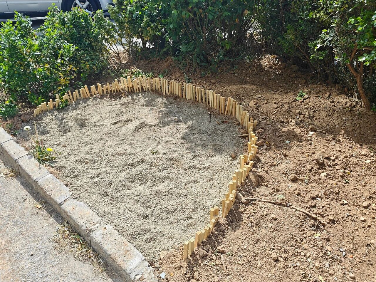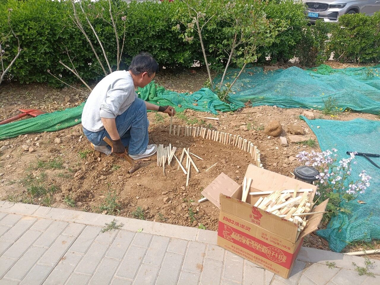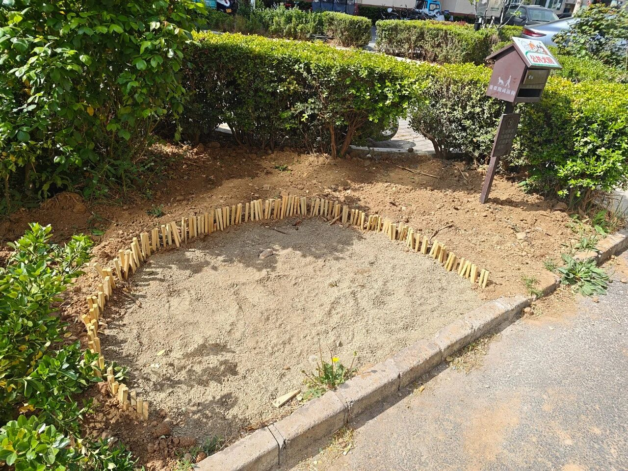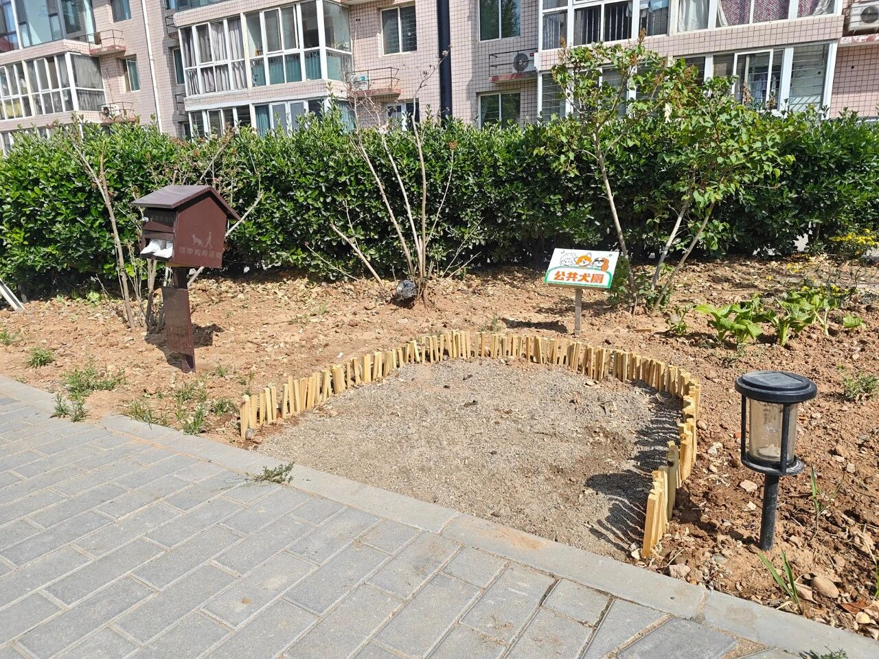 为践行绿色环保理念,社区充分挖掘可回收资源,将原本可能被丢弃的废旧木材边角料,精心加工成整齐的木质围挡。工作人员亲手将一根根木料有序钉入土壤,圈出干净的沙土区域,再搭配醒目的“公共犬厕”标识牌和拾便箱,一处既美观又实用的宠物如厕点便顺利建成。整个过程未额外采购新材料,既让废旧木料“重获新生”、节约了资源,也为社区增添了一道温馨的风景线。
