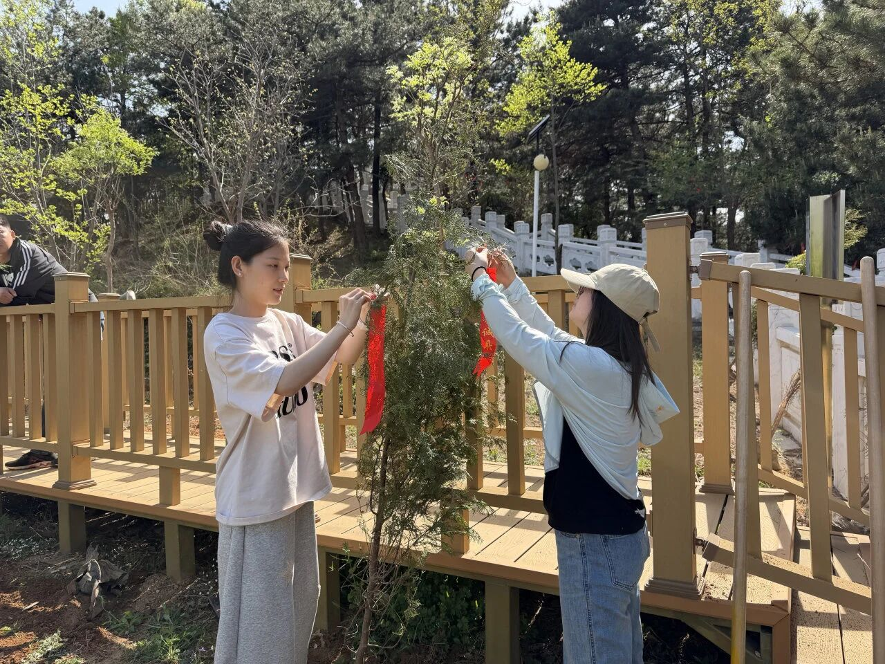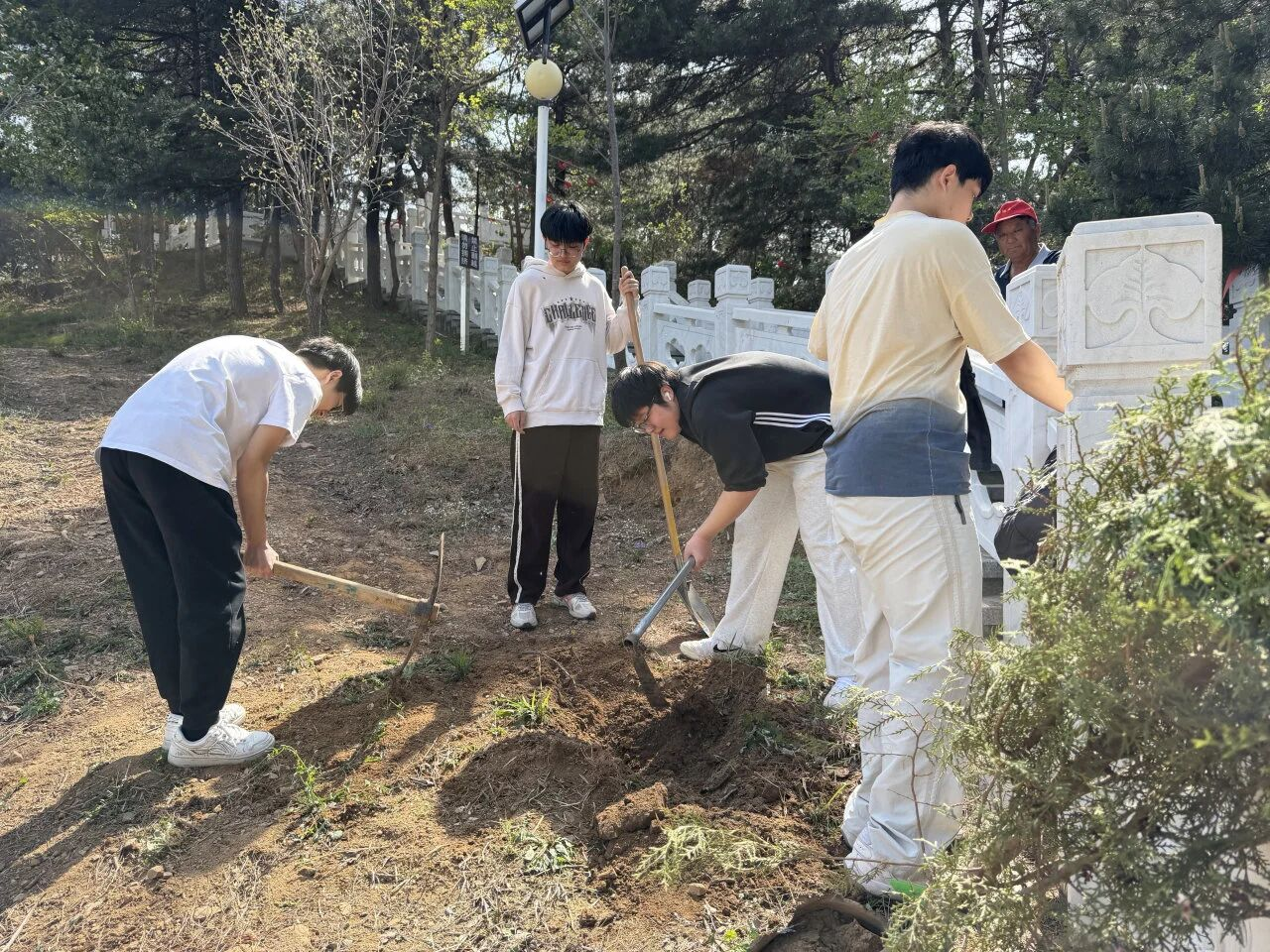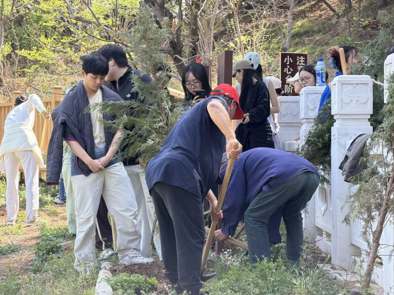 同学们两人一组、三人一队,配合默契,有的挥锹铲土,有的搬运树苗,有的提桶浇水,热情高涨的身影成为春日里一道亮丽的风景线。
