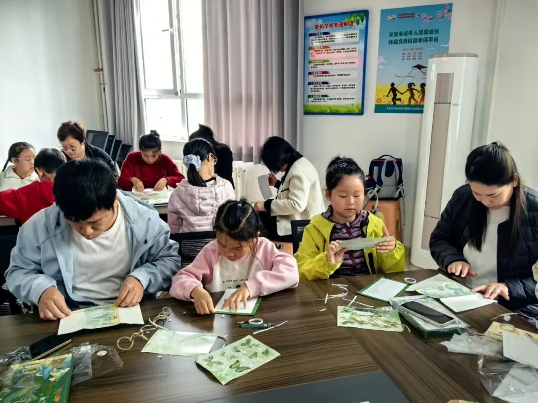 随后,活动进入手工环节——制作国风扇形书灯。在白老师和妇联志愿者的指导下,大家巧手翻飞,将扇面、灯带与古籍元素巧妙结合,制作出一盏盏雅致精巧的国风书灯。灯光亮起,扇面展开,仿佛“书中自有黄金屋”的美好意境跃然眼前。