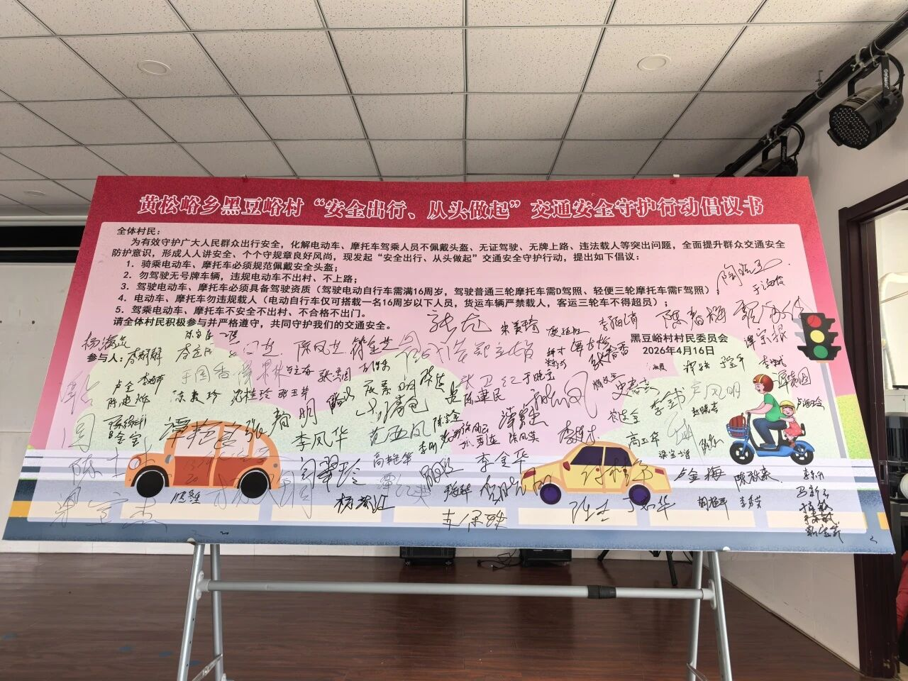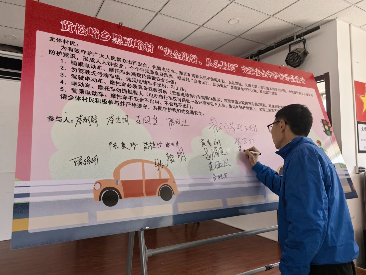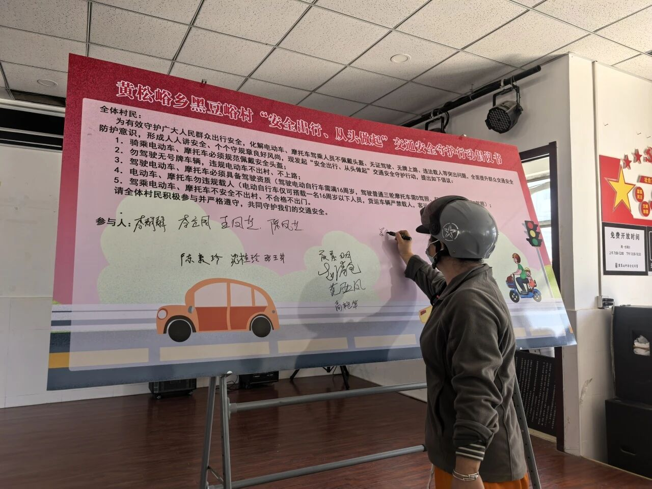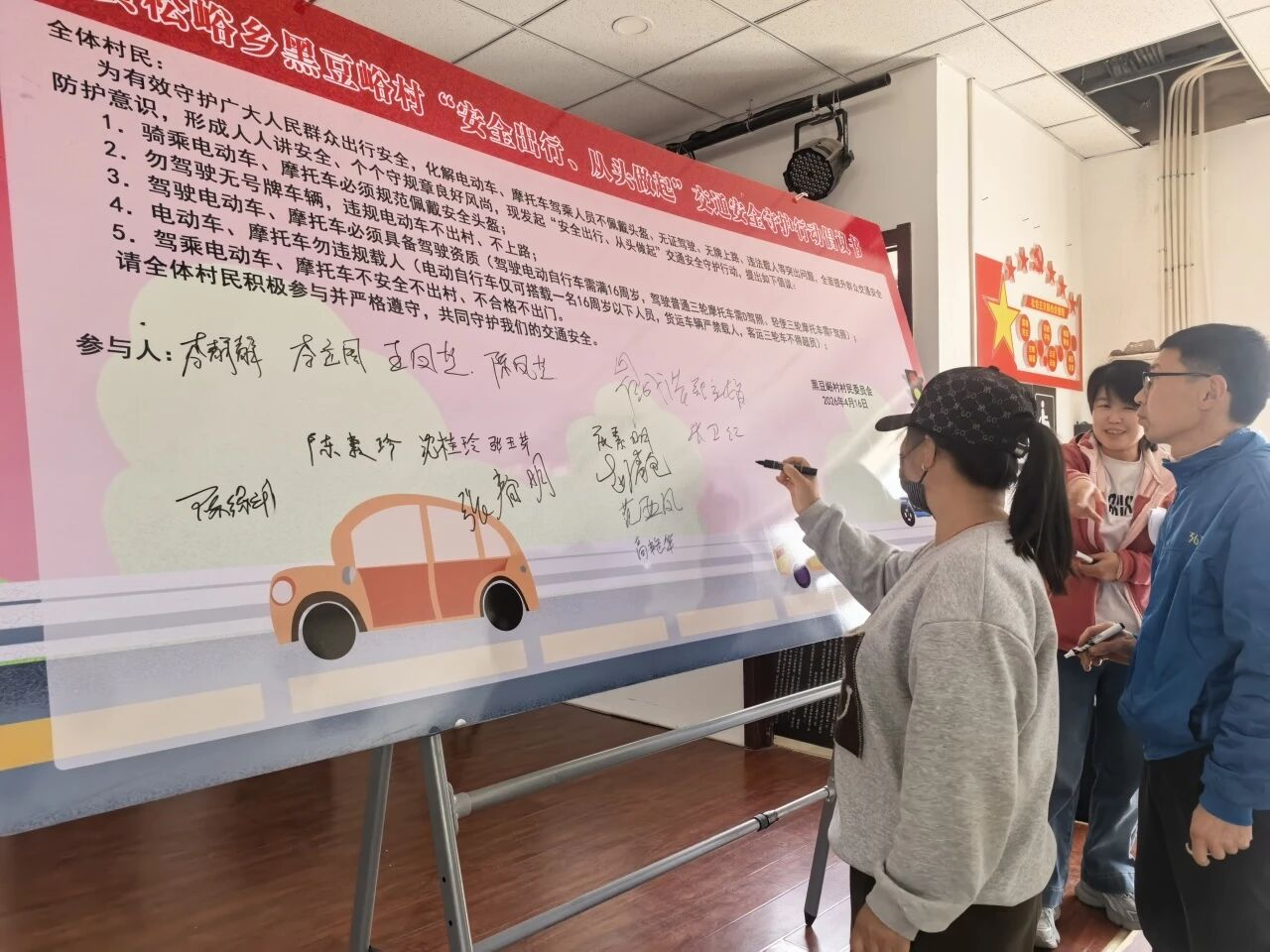 活动现场,一面印有行动倡议的签名墙格外醒目,上面清晰列出了“骑乘电动车、摩托车必须规范佩戴安全头盔”“不驾驶无牌无证车辆、不违规载人”“不驾驶不合格、报废车辆上路”等五项安全倡议,向全体村民发出文明出行号召。村民们纷纷上前,郑重地在倡议书上签下自己的名字,用实际行动许下“安全出行、文明出行”的承诺,密密麻麻的签名,既是一份约定,更是一份守护。