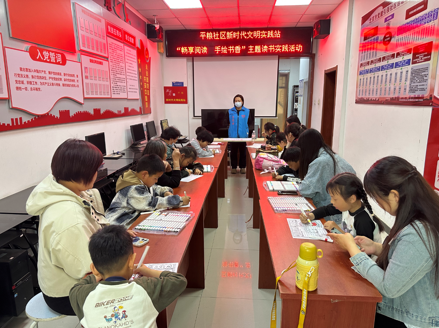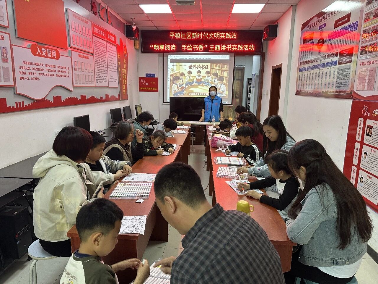 “畅享阅读 手绘书香”少儿读书实践活动中,平粮社区工作人员向孩子们普及世界读书日意义,倡导大家绿色健康阅读、合理使用电子产品。现场设置图书互换漂流、经典诵读、亲子共读、书香手工打卡等趣味环节。孩子们踊跃参与,主动分享读书心得,诵读经典美文,在轻松愉快的氛围中感受阅读魅力。亲子共读互动环节拉近了亲子距离,提升家庭阅读氛围。