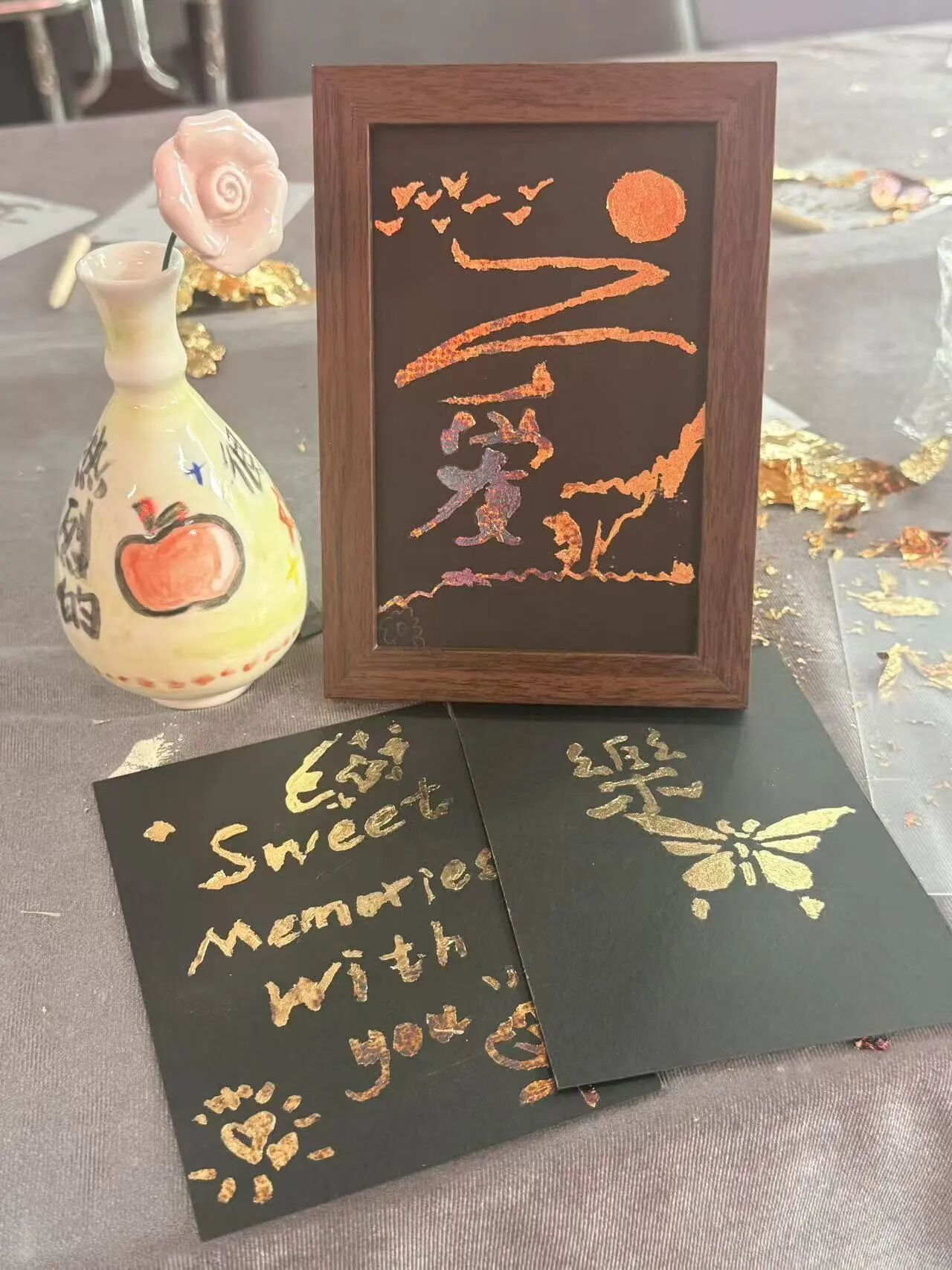 村民们凝神专注、动手实践,小心翼翼铺展金箔、彩箔,用心贴合、轻揉塑形,将细碎箔片错落点缀于画纸之上。指尖流转间,冷与暖、光与影相互交融,质朴底色搭配鎏金质感,肌理层次丰富雅致。