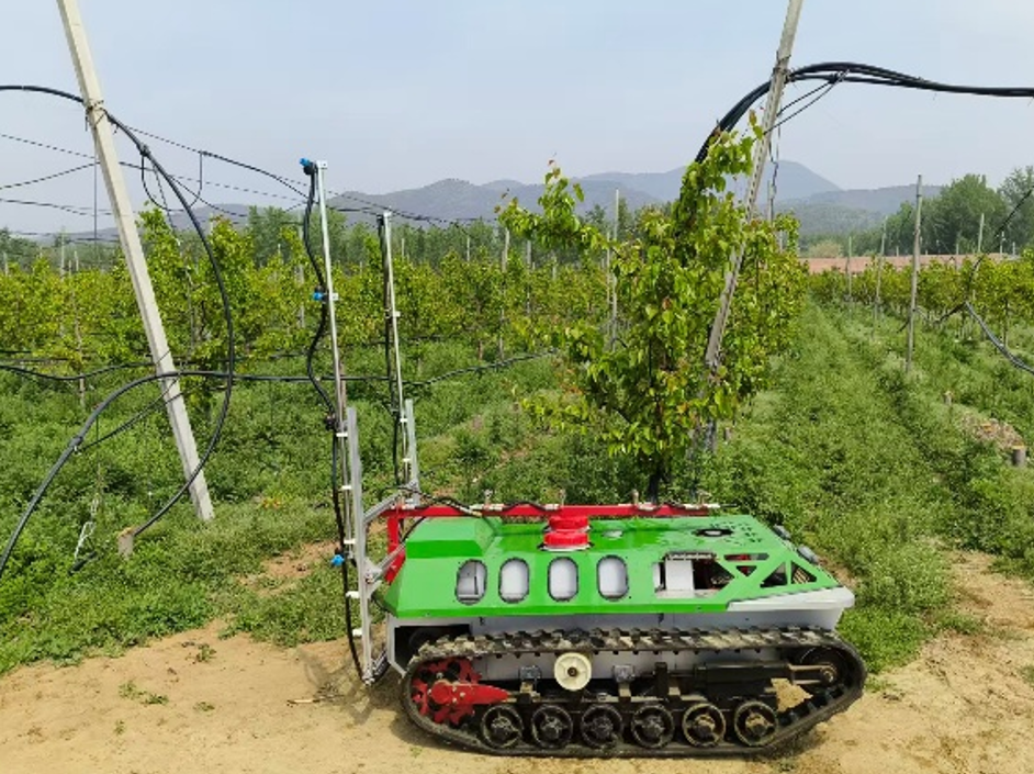 小院学生们在果园充分发挥其专业优势,为果园花期量身研发“黑科技”——无人遥感喷雾机。它采用履带式行走设计,能灵活适配梨园行距,有效避开花枝与花芽,杜绝损伤;搭配可调式雾化喷杆,可精准控制喷洒范围和药剂用量,既保证防治效果,又兼顾花期果树保护,完美解决人工打药效率低、易伤花、喷洒不均的痛点操控自主研发的无人遥感喷雾机开展实地打药。
