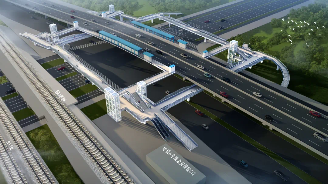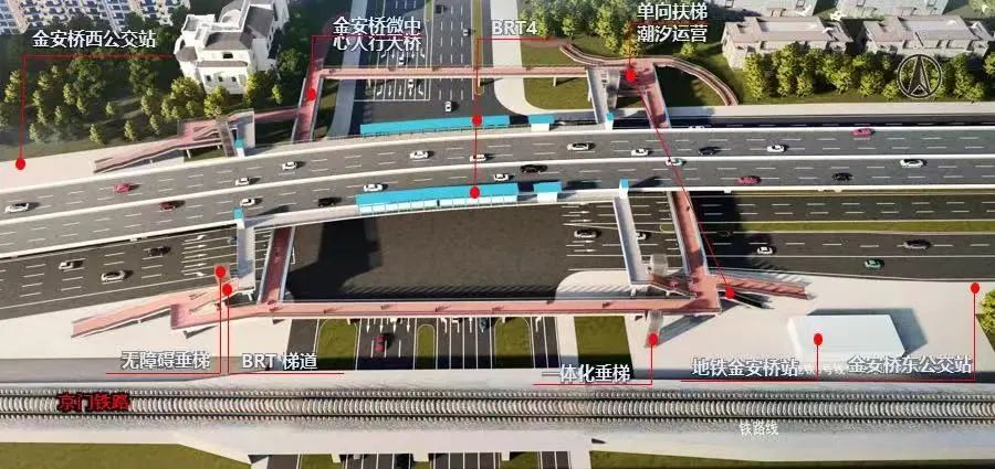 金安桥微中心人行天桥位于阜石路与北辛安路交汇处,下穿阜石路主路,上跨阜石路辅路,整体呈“口”字型,主桥全长421.8米,净宽约4米。天桥通过设置垂直电梯、自动扶梯、人行梯道,实现阜石路高架桥BRT站点、地面公交站点以及金安桥站换乘大厅等三层交通换乘。