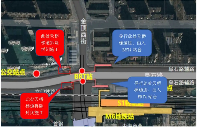 市民朋友根据阜石路辅路现有交通组织过街系统,可向东侧步行100米,由金安桥路口东侧现状梯道或坡道有序进出BRT4路快速公交金安桥站站台。