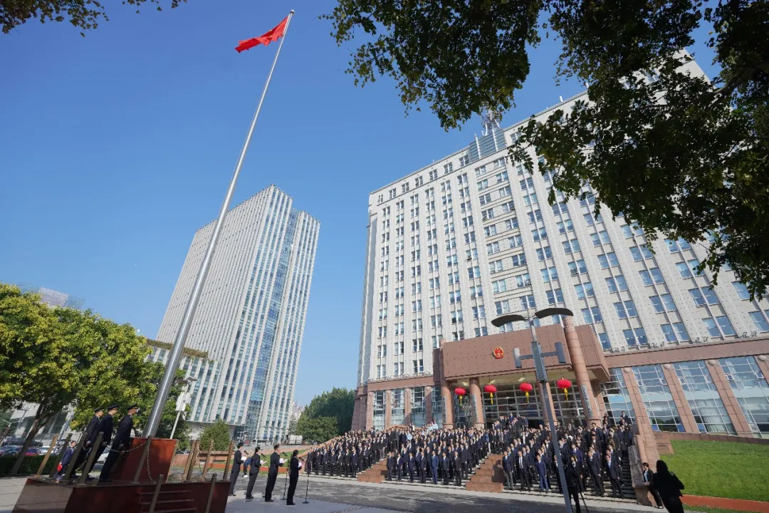 上午九时整,升旗仪式正式开始。旗手们肩擎鲜艳的五星红旗,迈着铿锵有力的步伐,护卫国旗走向升旗台。全体机关工作人员列队整齐、神情庄重,在雄壮的国歌声中,向冉冉升起的国旗行注目礼,并齐声高唱国歌,表达对祖国的无限热爱与崇高敬意。