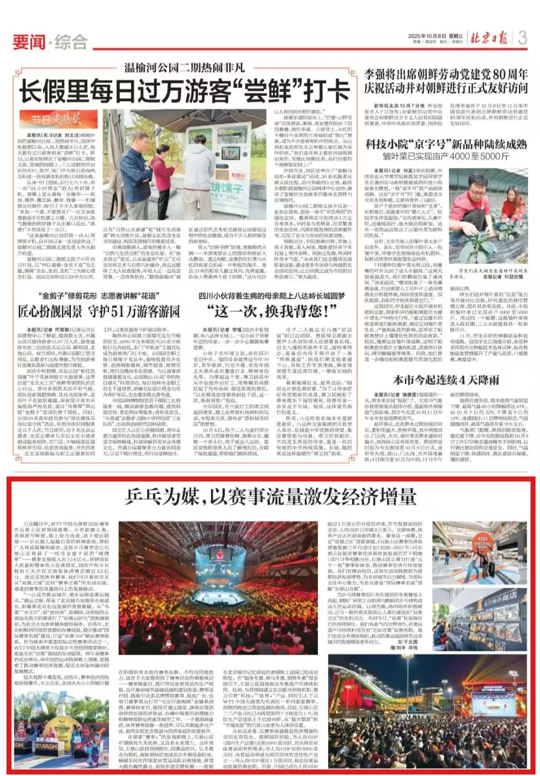万众瞩目中,WTT中国大满贯2025赛事在石景山区首钢园落幕。小将崭露头角,老将续写辉煌,场上奋力竞逐,场下彼此鼓励……乒坛健儿超越自我的拼搏姿态,带给广大球迷鼓舞和感动,这场乒乓赛事也让石景山区收获了一张含金量十足的“成绩单”——赛事直接收入近1.54亿元,首钢园区人流量和整体收入显著增长,国庆中秋小长假前五天全区文商旅体消费总额近3.2亿元。透过这场体育赛事,我们可以看到北京从“双奥之城”迈向“赛事之都”的生动实践,感受到赛事经济蓬勃向上的发展脉动。