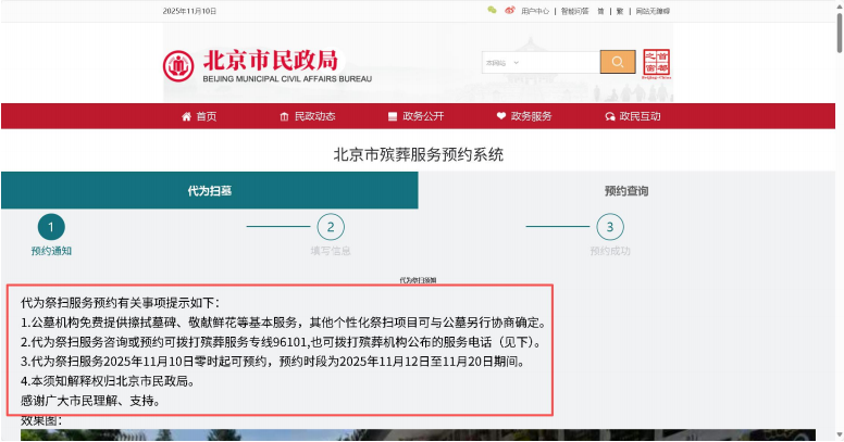 5.页面顶部显示代为祭扫预约提示信息,涉及代为祭扫服务内容、预约方式、可预约时间段等内容。
