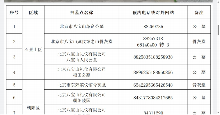 6.页面下面依次显示代为祭扫现场图及各祭扫点服务预约电话。可通过拨打相关殡葬机构服务电话进行代为祭扫服务预约,除擦拭墓碑、敬献鲜花等基本服务外,其他个性化祭扫项目可与公墓另行协商确定。