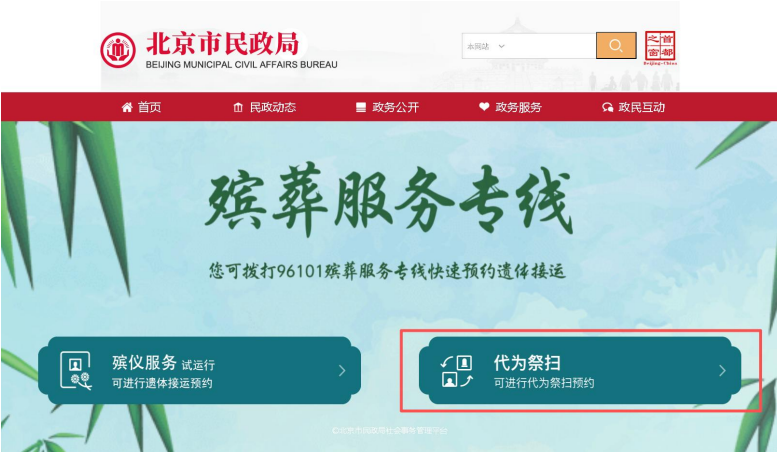 4.登录后页面跳转至“社会事务管理平台”页面,点击右侧“代为祭扫”可进入代为祭扫服务预约页面。