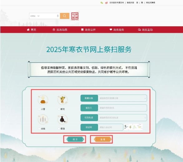 3.在“网络祭扫”页面,可选择“上香”“献花”“点烛”“祭酒”等祭扫形式,并填写“祭奠对象”“留言人”“纪念私语”“验证码”等信息,点击底部“提交”按钮即完成网络祭扫,页面跳转至“查看”页面,可查看所有人的祭扫留言信息。
