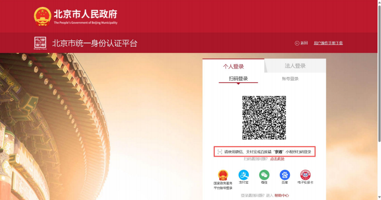 3.页面跳转至“统一身份认证”平台页面,可通过微信、支付宝、百度端“京通”小程序扫码登录。