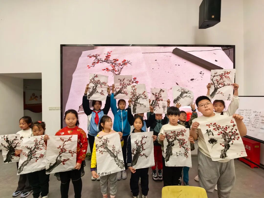 在实践环节,同学们积极尝试,认真作画。在老师的鼓励和点拨下,同学们渐入佳境,笔下的梅花形态各异——有的含苞待放,有的傲然盛开,有的依偎枝头。墨色在宣纸上自然晕染,既保留了国画的典雅韵味,也流露出孩子们纯真的灵气。一位同学表示:“画梅不仅要动手,还要动脑筋构思布局,感觉自己的专注力也提升了。”