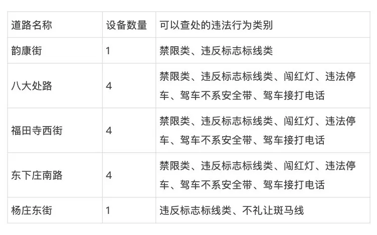 可查处禁限类、违反标志标线类、闯红灯、违法停车、驾车不系安全带、驾车接打电话、不礼让斑马线等违法行为。