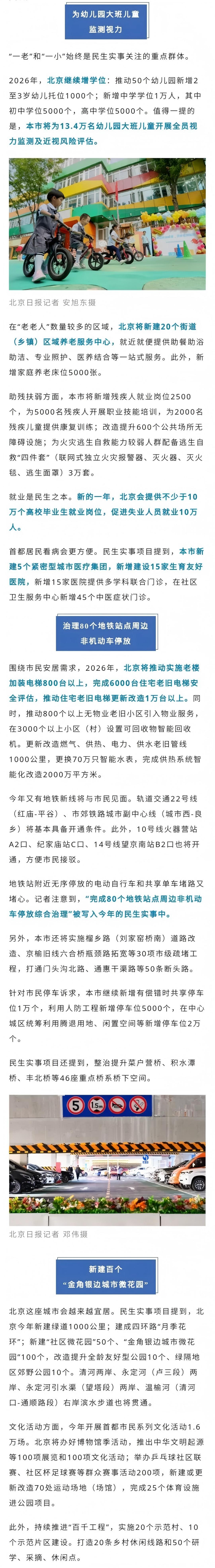 一年一度的民生实事清单,又出炉了!2月3日,《北京市2026年重要民生实事项目》在首都之窗网站公布。据悉,今年待办的27件民生实事涉及托幼育人、颐养暖心、出行便利、休闲宜居等10个方面。其中,北京将为13.4万名幼儿园大班儿童开展全员视力监测及近视风险评估。