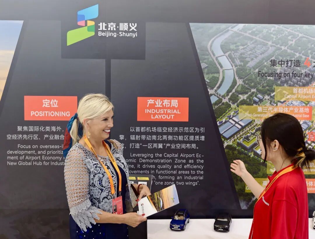 外籍观众在展区了解顺义区产业布局。