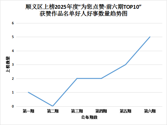 顺义区上榜2025年度“为您点赞·前六期TOP10”获赞作品名单的好人好事数量呈现出整体上升趋势。这一变化的背后是顺义区对好风气建设的高度重视与持续深耕——定期召开统筹推进会议,总结阶段性成果,部署下一步工作;常态化发现、宣传、激励好人好事,持续拓宽线索发现渠道,利用党员大会、公开栏和各媒体平台大力宣传推广,推广表扬信、会议通报等激励方式;锚定源头,优化志愿服务体系,调动市民参与志愿服务的积极性……在顺义的大街小巷,好人好事不断涌现,崇德向善蔚然成风。