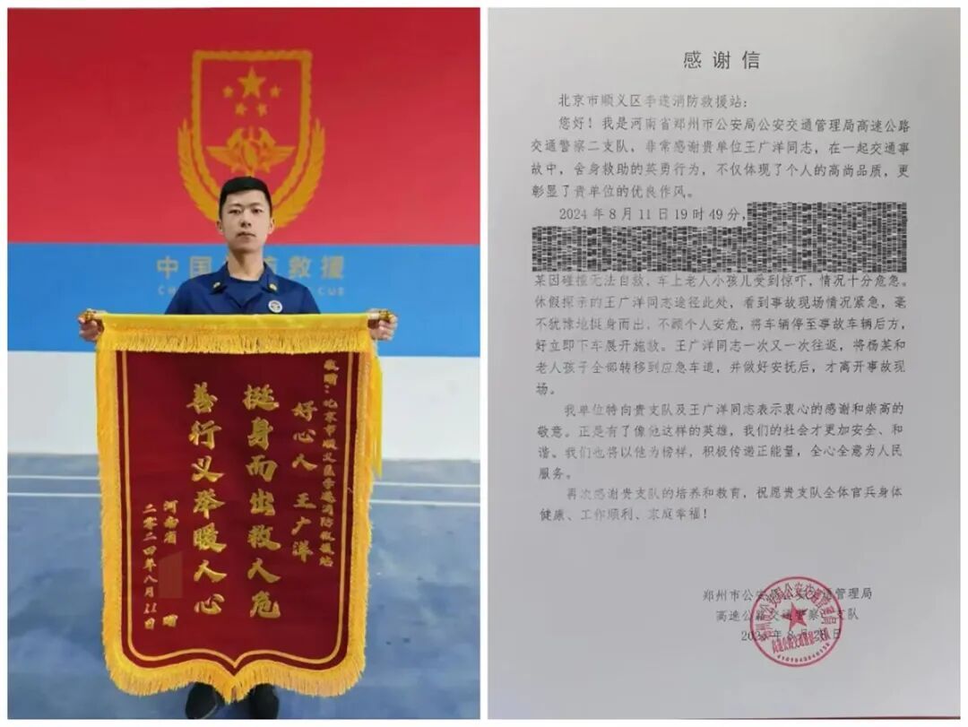 王广洋收到车主寄送的锦旗、郑州市交通支队寄送的表扬信。