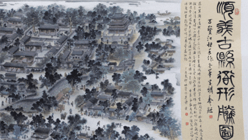 这幅长达2.93米、宽1.05米的画作,不仅是一件艺术珍品,更是一台“时光机器”。当画卷徐徐展开,顺义老城风貌便在眼前缓缓铺陈:三进三院三间房的县衙位于减河南岸、潮白河西岸,东西两侧的古槐亭亭如盖,栩栩如生的人物穿梭在街巷中。