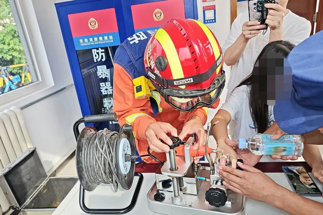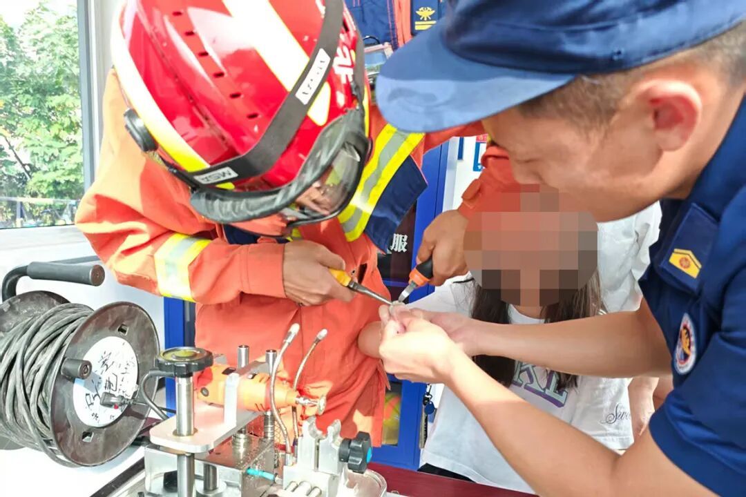 明确情况后,救援人员一边安抚女孩,一边拿出指环切割机准备进行剪切。一名救援人员先将小铁片垫在指环和手指之间,对手指进行保护,随后轻轻调整女孩手指的角度,精准、缓慢进行切割。另一名救援队员则持续对着切割点喷水降温,防止高温灼伤女孩皮肤,并不断安慰女孩:“别紧张,我们动作很轻,马上就好。”