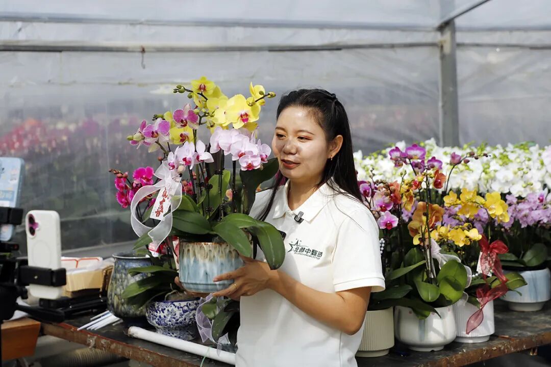 “这款蝴蝶兰花色艳丽,花期也长,非常适合装点家里……”大棚内,主播正在介绍着各式各样的蝴蝶兰盆景,精致的造景、美好的寓意吸引直播间消费者下单。