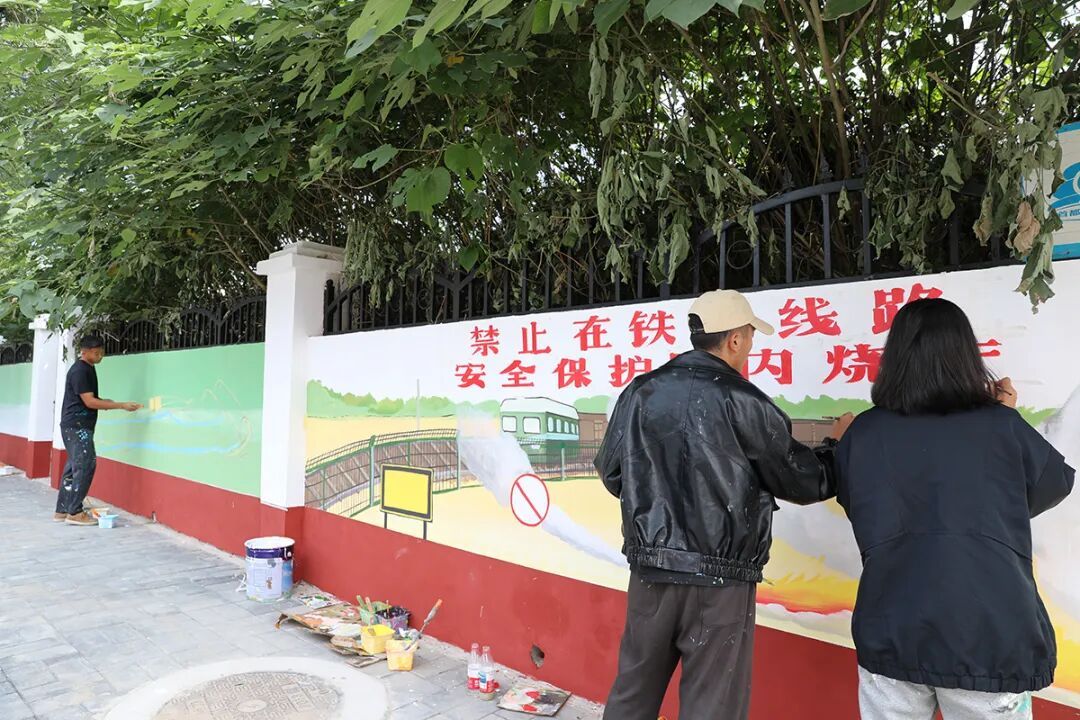 画师在铁西路一侧的墙上绘制文明宣传主题彩绘。