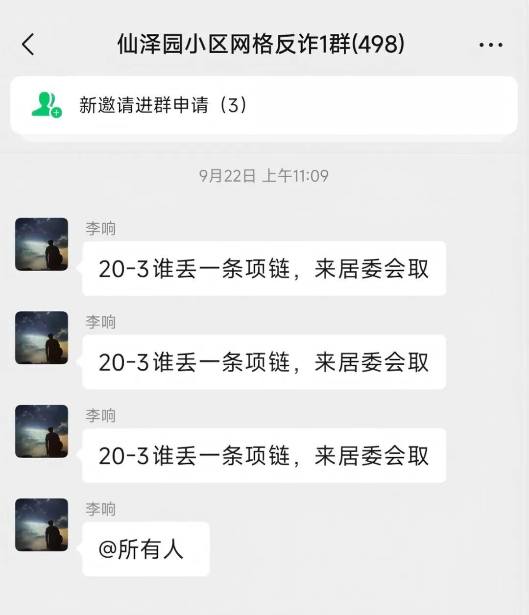 社区工作人员立即登记信息并妥善保管项链,网格员前往项链拾取处的单元楼,向周边居民进行询问,同时利用覆盖全社区的微信群发布失物招领信息:“20-3谁丢一条项链,来居委会取。”