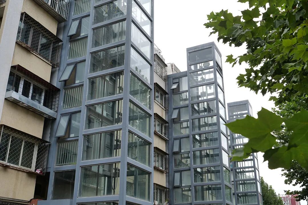 一部部崭新的电梯加装在老楼外
