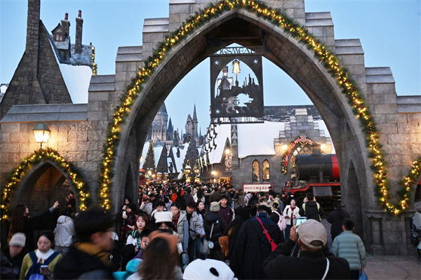 好莱坞大道的冬日氛围同样令人沉醉。洁白的“雪花”随风飘落,与悠扬的冬日音乐交织在一起。大道尽头,炫彩灯光爬上星耀树枝头,灯光与“雪花”相互映衬,行人漫步其间,或驻足欣赏,或拍照留念,仿佛置身于电影中的唯美场景。此外,园区内限时上新的冬日主题商品也备受游客青睐,从印有限定图案的保暖围巾、手套,到造型可爱的冬日玩偶、节日装饰,让游客能够把环球的冬日记忆带回家。