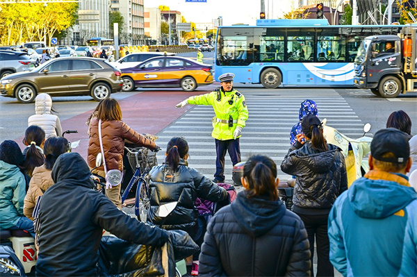 初冬清晨七点半,通州区爱琴海十字路口已是一片繁忙。机动车流络绎不绝,而在非机动车道上,骑行通勤的市民与送孩子上学的家长也在逐渐增多。在路口非机动车停止线前方,交警忙碌的身影十分醒目,几位骑车人在接近路口时,早早减速,在交警的引导下,整齐地将车辆停在了白线以内,安静地等待着绿灯亮起。