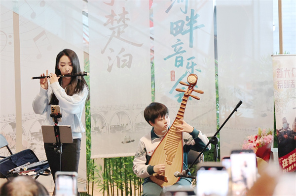笛声悠扬,仿佛携着千年运河的水波与风声,在现代建筑的广阔空间里自由萦绕。艺术家走下专业舞台,观众也不必正襟危坐——高品质的艺术就这样自然而然地,流淌进一个平常的周末。活动不乏“彩蛋”,来自潞河中学的乔云同学怀抱琵琶走上台,与孙楚泊即兴合奏了一曲《春江花月夜》。笛声清越,琵琶叮咚,两人虽然是初次合作也赢得了大家的掌声。“我在孙老师身上看到了新时代民乐的发展,”乔云在演出后说,“她让传统民乐变得时尚、可亲近。我要向她学习。”