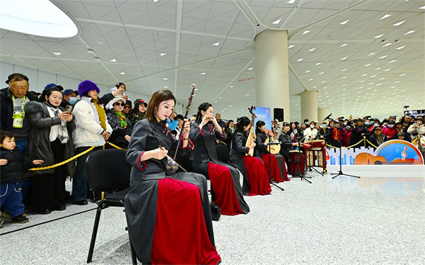 音乐会在《金蛇狂舞》激昂澎湃的旋律中热闹开场,瞬间点燃了现场气氛。一首首家喻户晓的民乐接连奏响,既蕴含传统韵味,又充满现代活力,动静结合,亮点纷呈。《喜洋洋》《步步高》旋律轻快活泼,让整个车站洋溢着祥和欢乐的节日氛围;《新赛马》奔放热烈,仿佛骏马奔腾。《春江花月夜》宁静幽远,诗乐相融,勾勒出优美的山水画卷,将观众带入古典意境之中;压轴曲目《花好月圆》旋律优美流畅,寄托着美满团圆的寓意,传递出对观众的美好祝福。